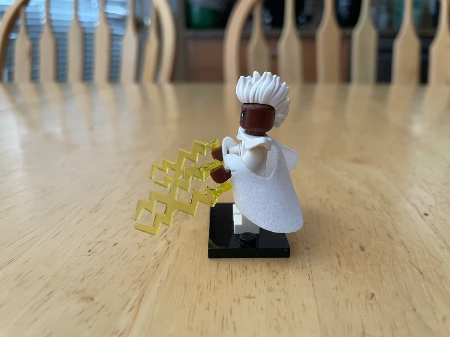 This is a LEGO minifigure of Storm from X-Men. It comes with lightning bolt accessories and a display stand.