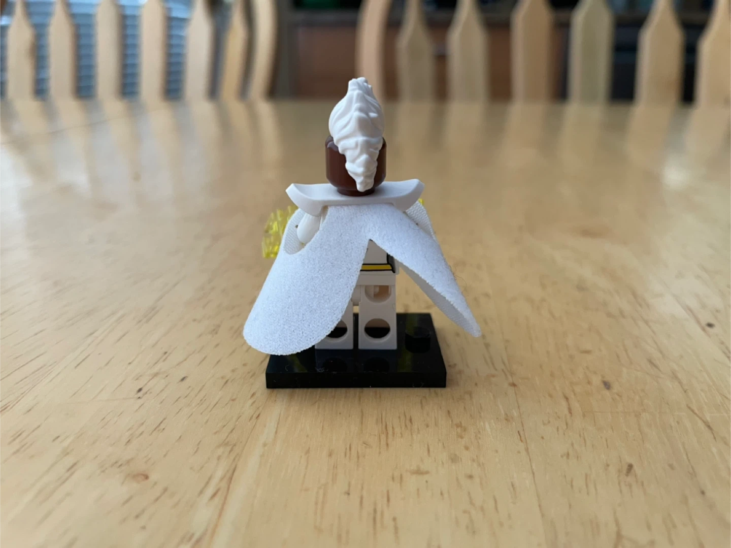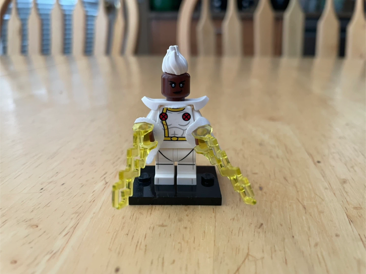 This is a LEGO minifigure of Storm from X-Men. It comes with lightning bolt accessories and a display stand.