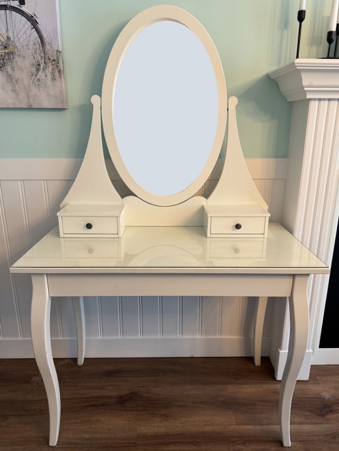 Buy & SellIKEA Vanity Table with MirrorIKEA Vanity Table with Mirror$80White vanity table with mirror and four drawers. Glass top- no chips. Screws included. Very good condition.ConditionGoodWHERE TO MEETCheck LocationView MapSELLERverifiedMelanieCreighton W831 review3 chats·2 favorites·91 viewsSEND CHAT TO SELLERHi Melanie! I’m interested in your listing.Hi Melanie! I’m interested in your listing.Get the Karrot app to chatSign In to chat