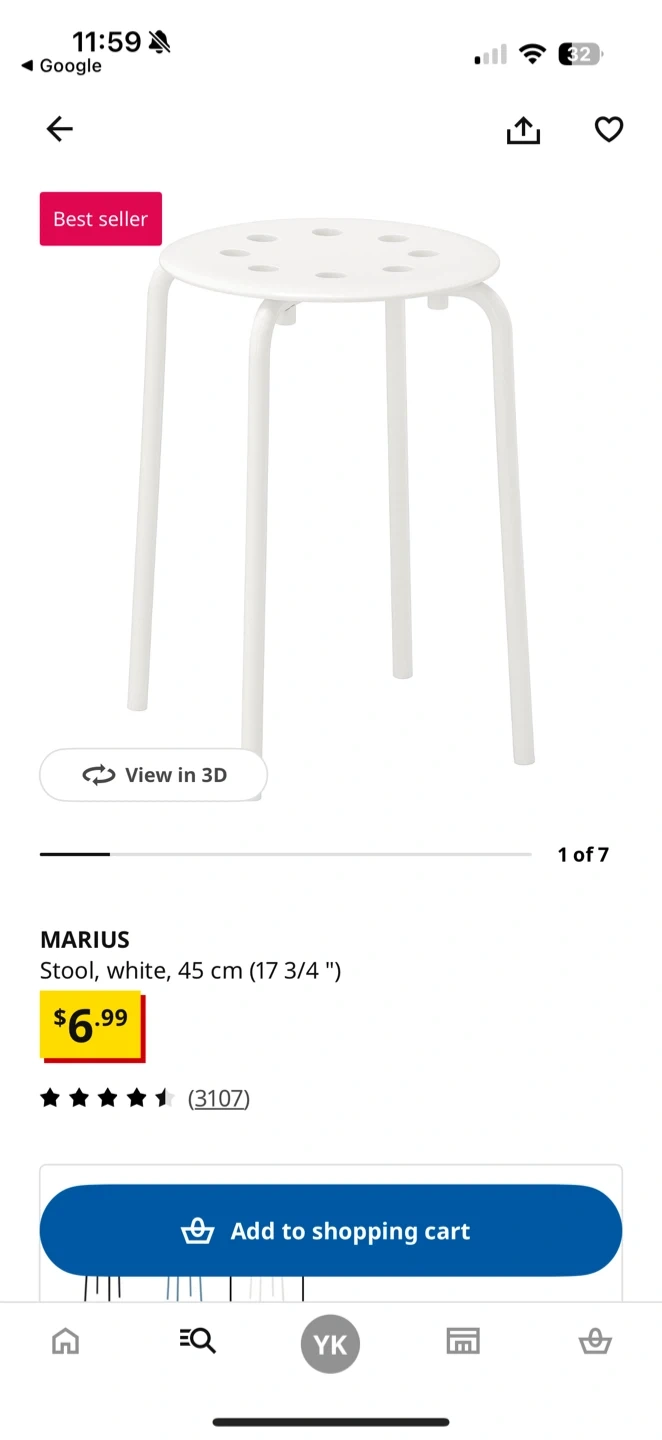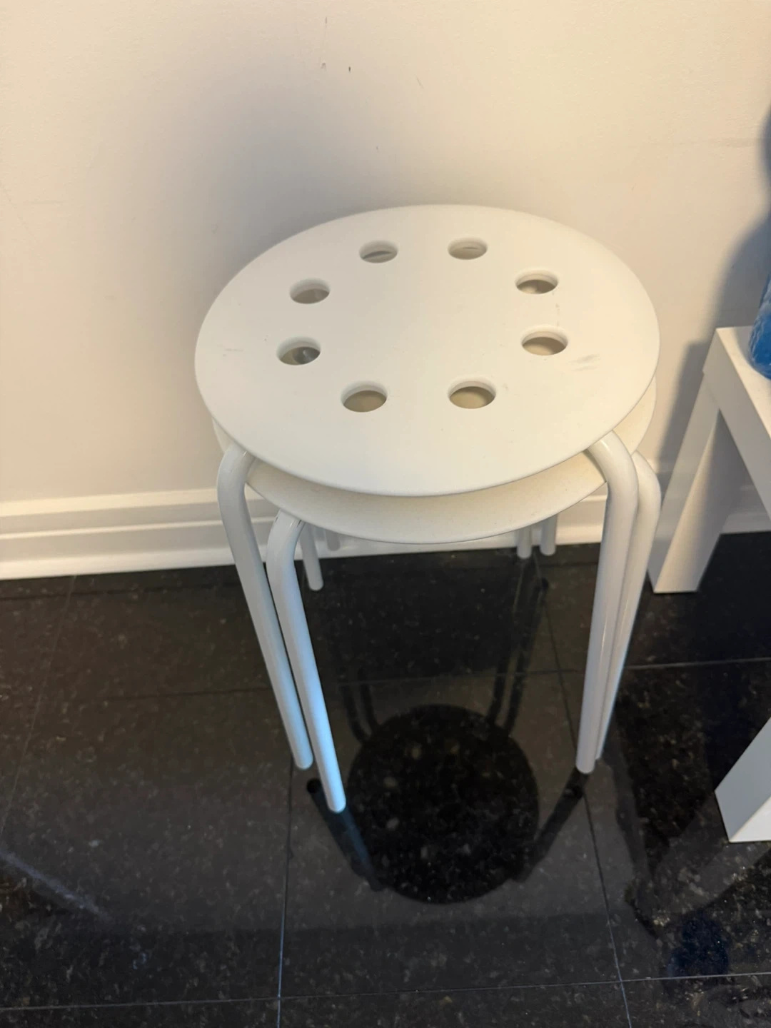 White IKEA MARIUS stool, 45 cm height. It's stackable for easy storage! This stool is handy for extra seating when you need it.
