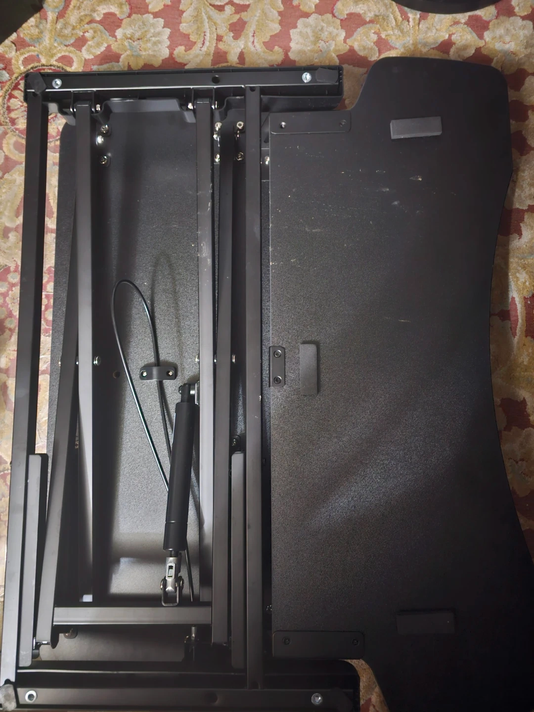 This is a VIVO standing desk converter, black. It has a gas spring for easy adjustment. TSCA Title VI Compliant. Made in December 2020.