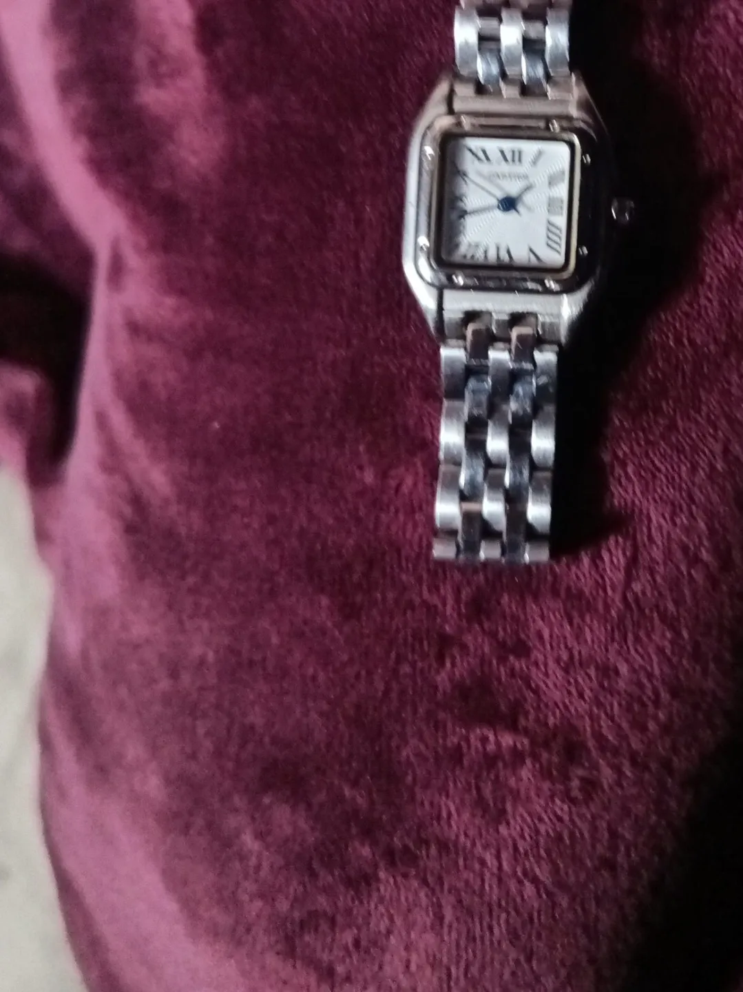 Ladies Cartier Panthere watch. Silver-tone stainless steel case and band. Roman numeral dial with blue hands. It's a classic timepiece!