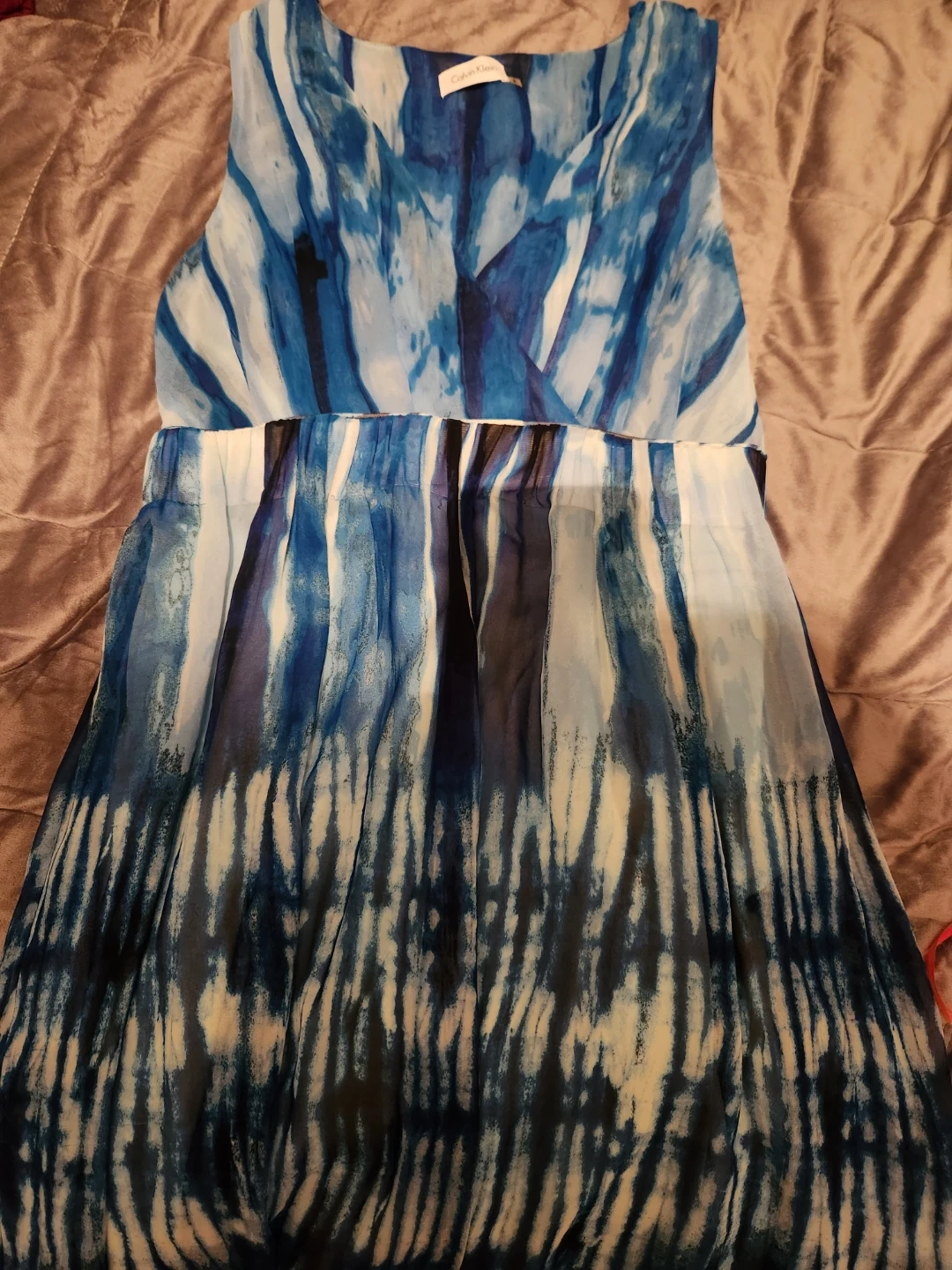 This is a Calvin Klein sleeveless dress with a blue tie-dye pattern. It's a size 8. The dress has a V-neckline and a cinched waist. It's made of lightweight material perfect for warmer weather! If you interested chat with me and I'll give you the meeting spot/my address.