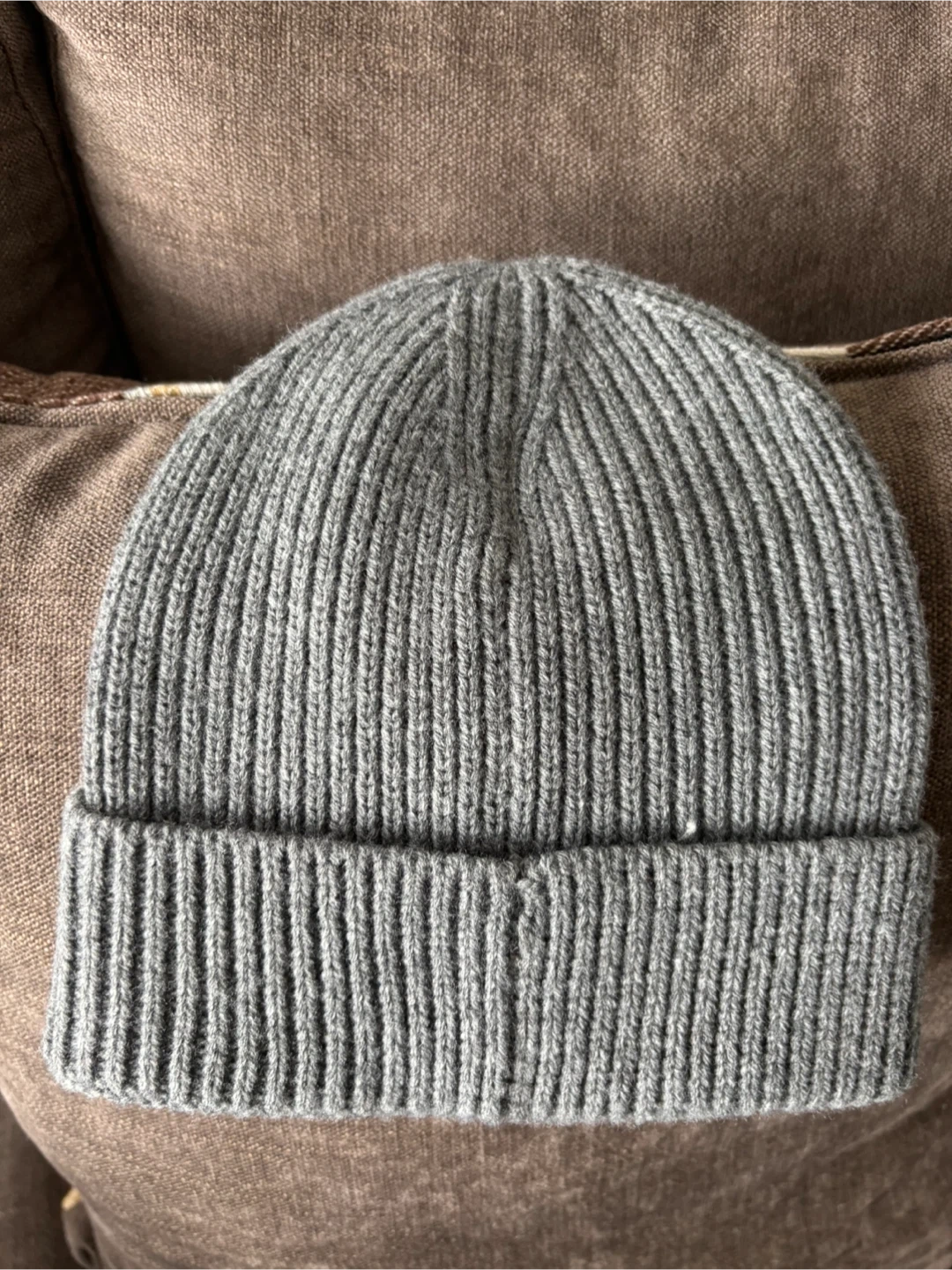 This is a grey ribbed beanie from The North Face. It's made of a knit material.