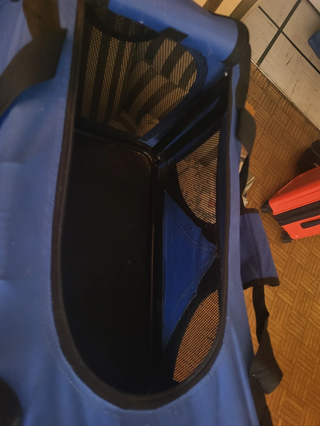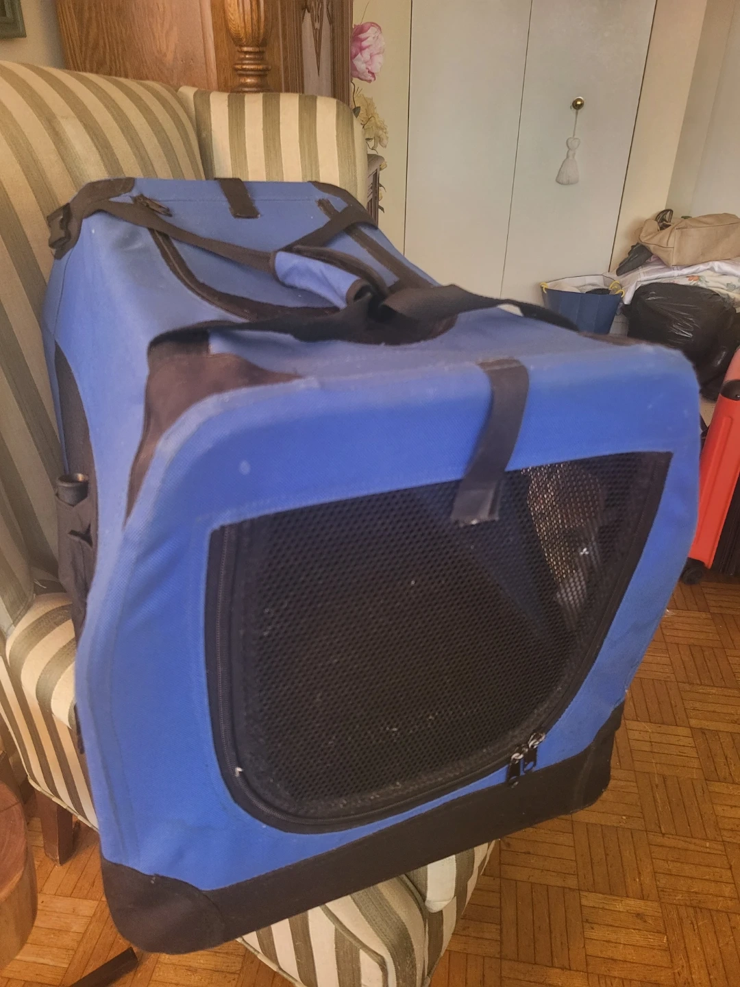 Selling a blue pet carrier! It's in good condition and ready for your furry friend's next adventure. It has black accents and mesh windows for ventilation