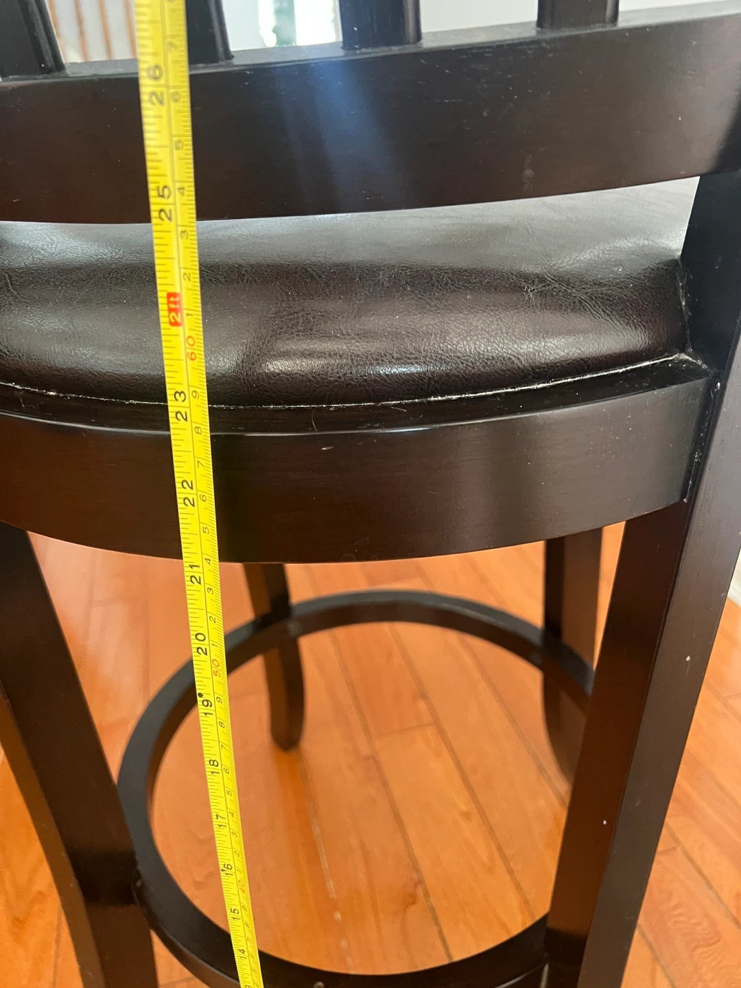 A dark brown bar stool featuring a padded seat. The seat height measures approximately 23 inches. This stool is made of wood with a dark brown finish and a dark brown upholstered seat.