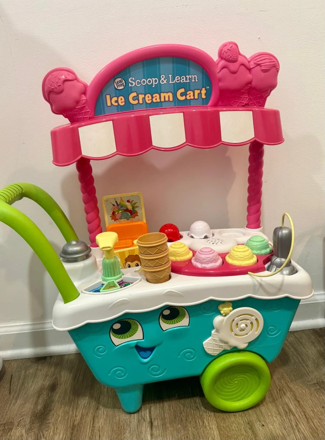 This Leap Frog Scoop & Learn Ice Cream Cart is a fun toy for kids. It includes various ice cream scoops and cones for imaginative play. It's made of durable plastic and is designed for children's entertainment.