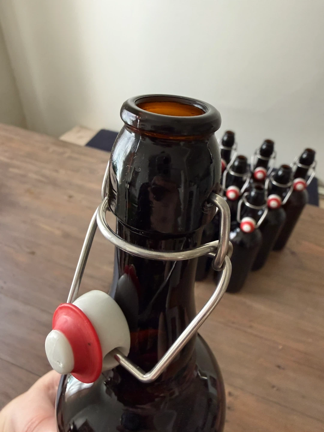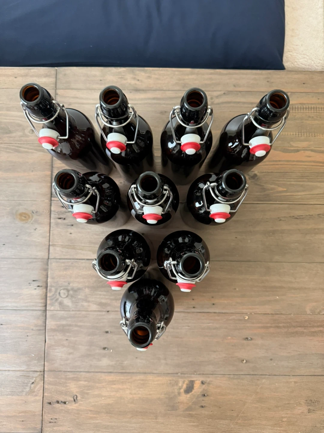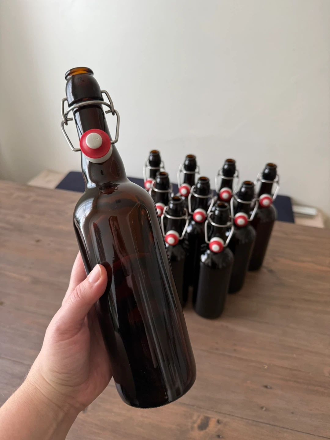 Set of ten (10) brown glass pop-top bottles that hold 750mL perfect for at-home brewing, kombucha, syrups, and the like.