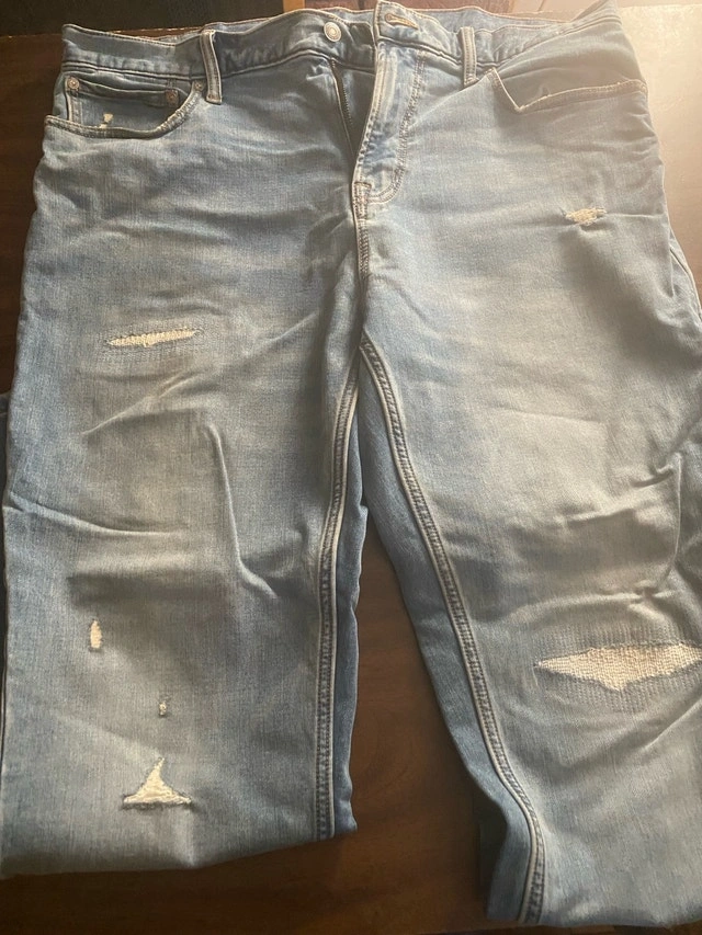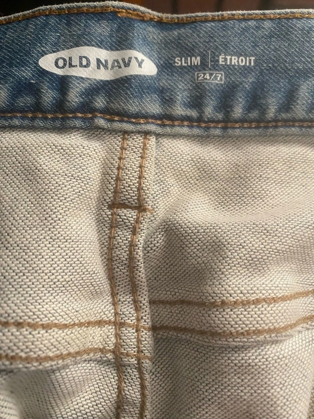 These are Old Navy slim fit, medium wash jeans, perfect for a casual, stylish look! The jeans show some wear and tear, which adds character and a cool, edgy vibe. Perfect to pair with your favourite band tee for a night on the town. Details: Brand: Old Navy, Fit: Slim, Wash: Medium, Style: Ripped. If the ad is up, the jeans are still available! Price is firm.