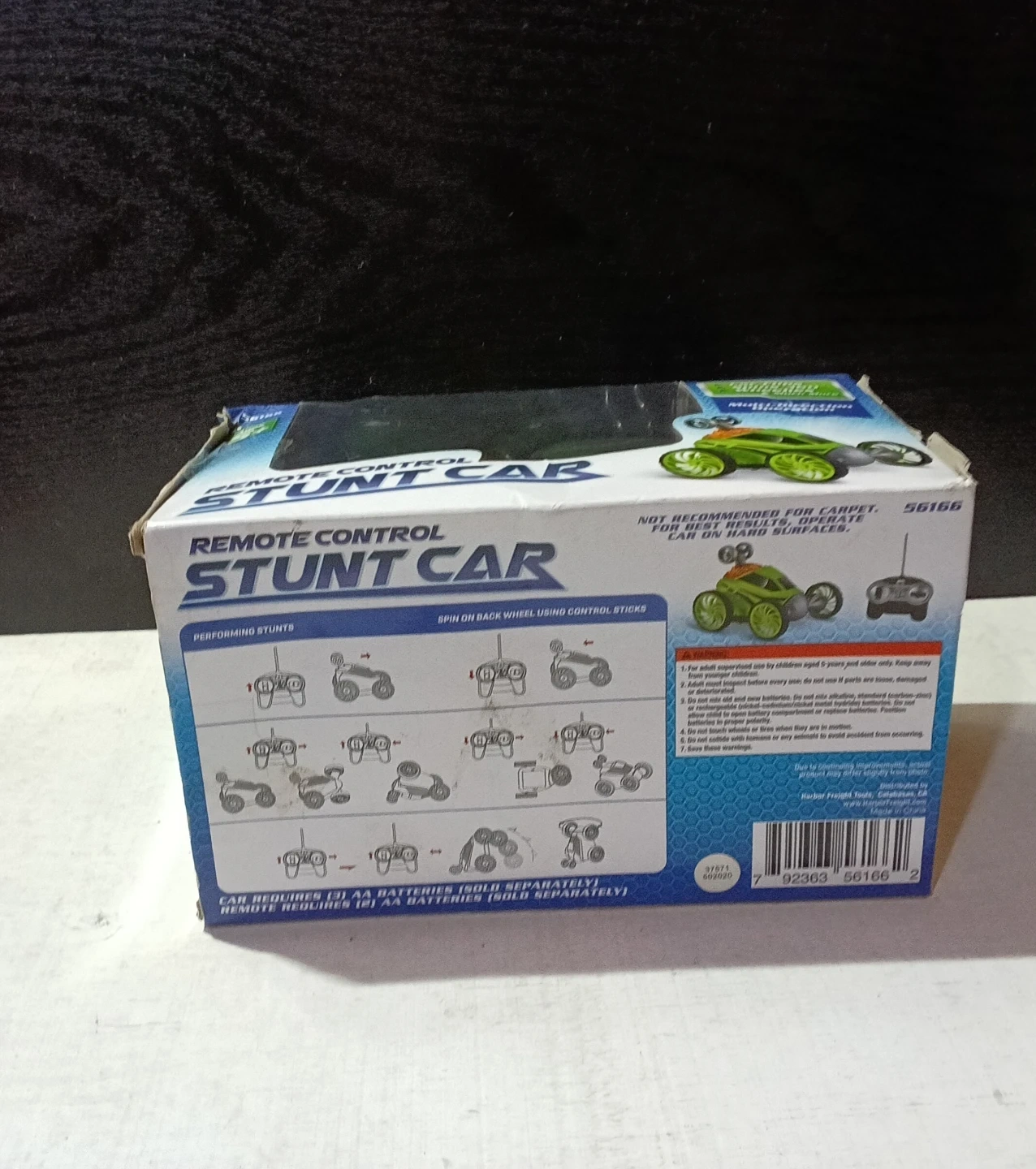 Selling a brand new, in-box Remote Control Stunt Car! The box says it's suitable for ages 5+. It can do car flips, spins 360°, wheelies, and much more! Remote requires (3) AAA batteries, and the car requires (3) AA batteries (batteries not included)