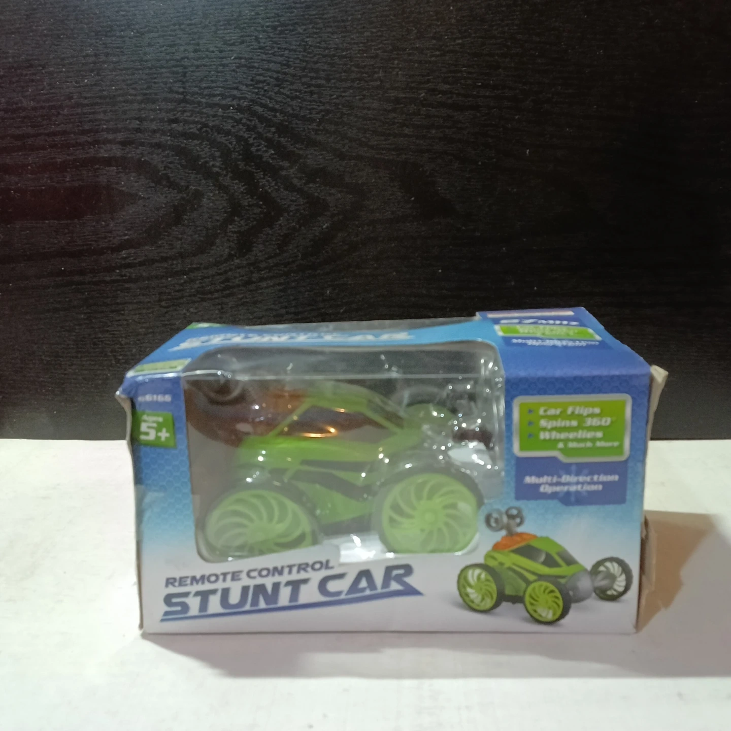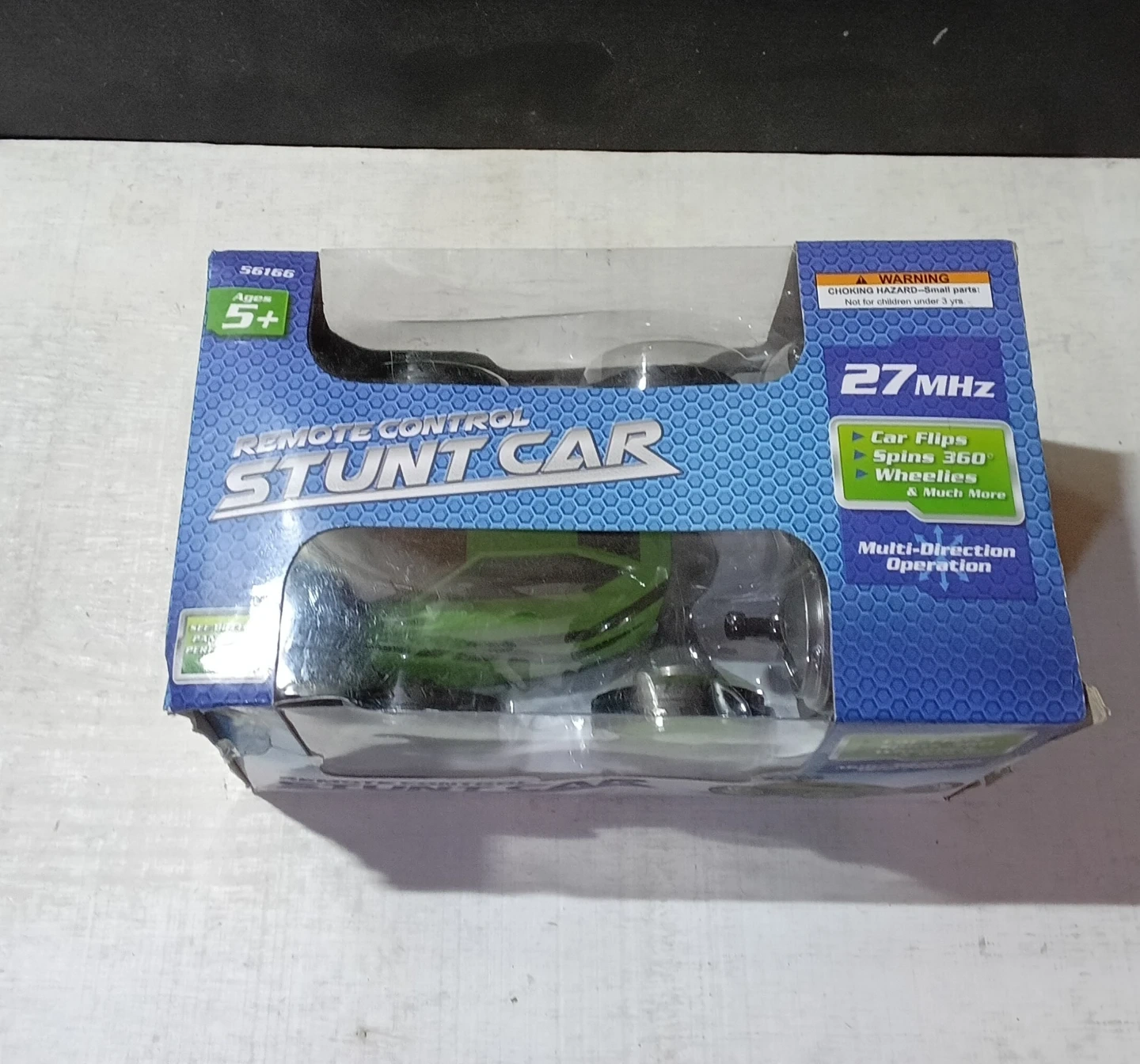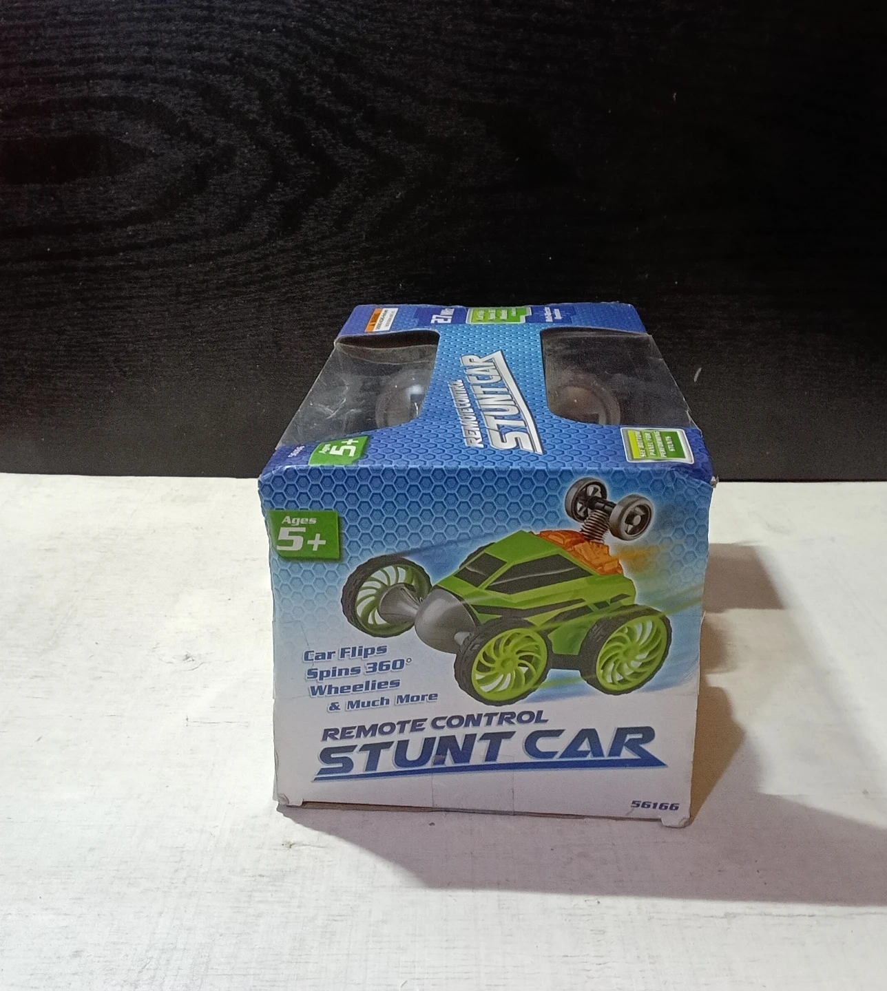 Selling a brand new, in-box Remote Control Stunt Car! The box says it's suitable for ages 5+. It can do car flips, spins 360°, wheelies, and much more! Remote requires (3) AAA batteries, and the car requires (3) AA batteries (batteries not included)