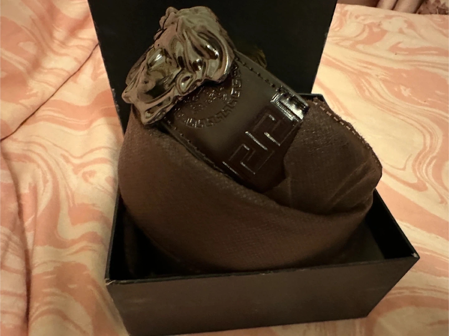 Beautiful Versace belt featuring the iconic Medusa head buckle. It's made of dark brown leather and comes in its original box. This belt adds a statement piece to any outfit!