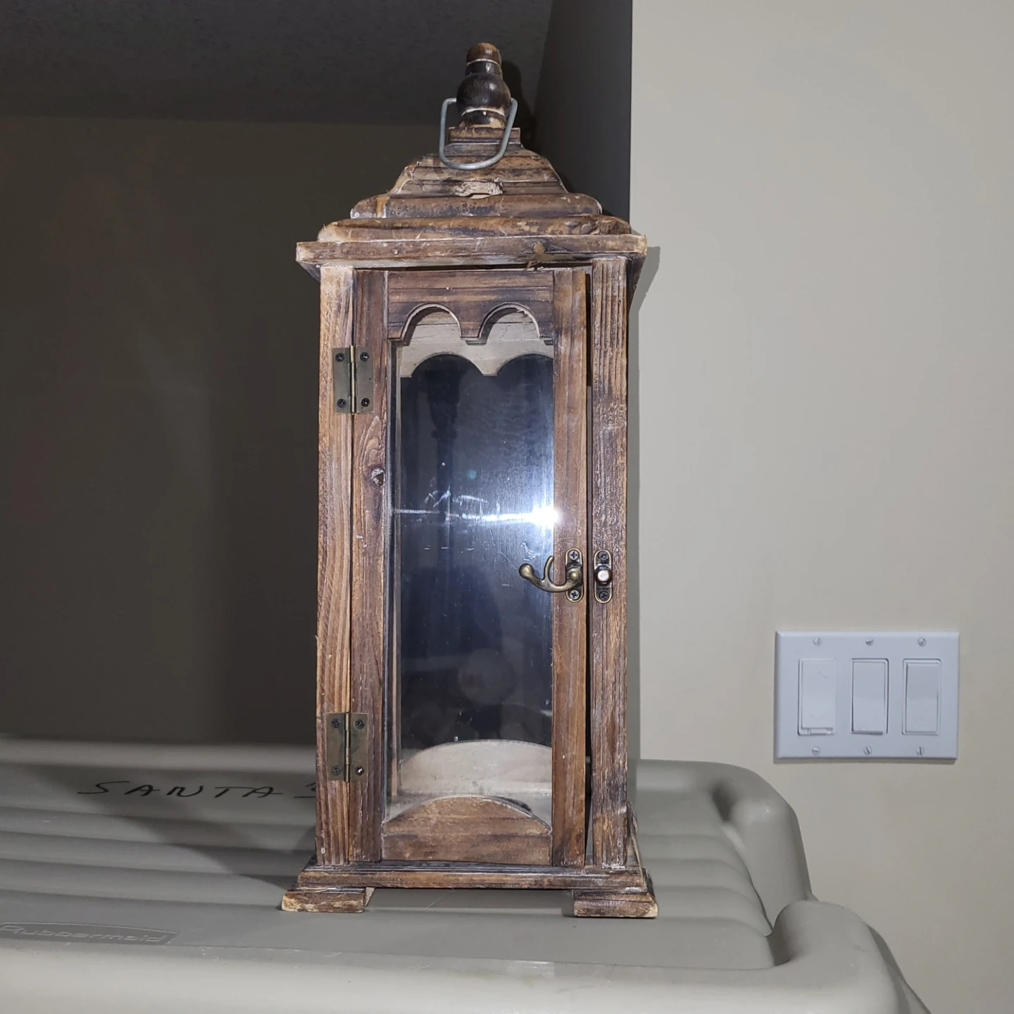 This vintage-inspired wooden lantern features glass panels and a decorative metal latch.