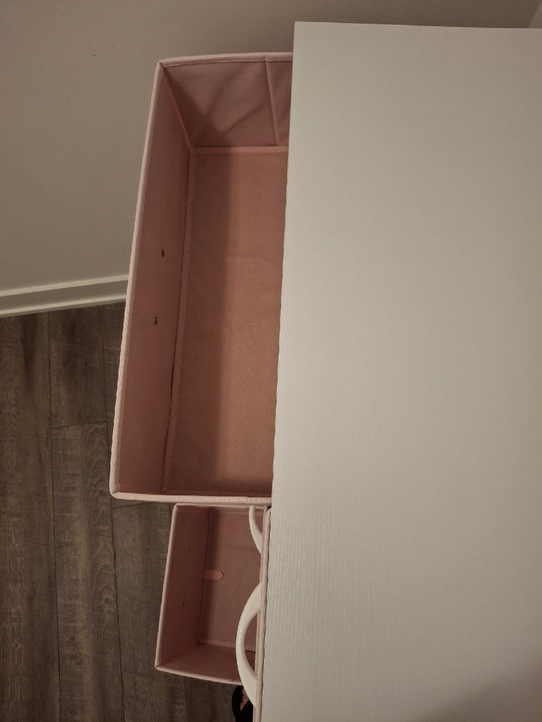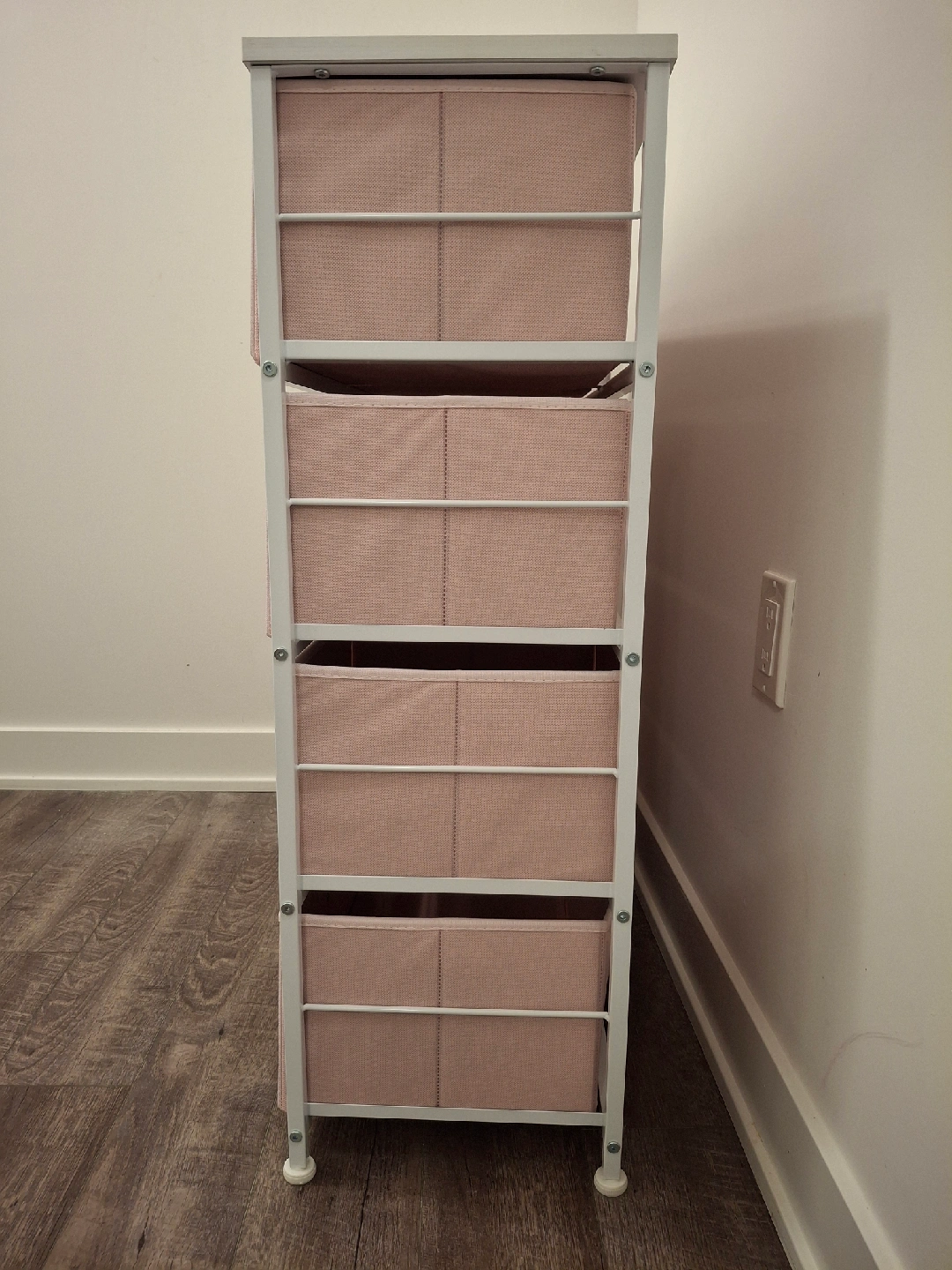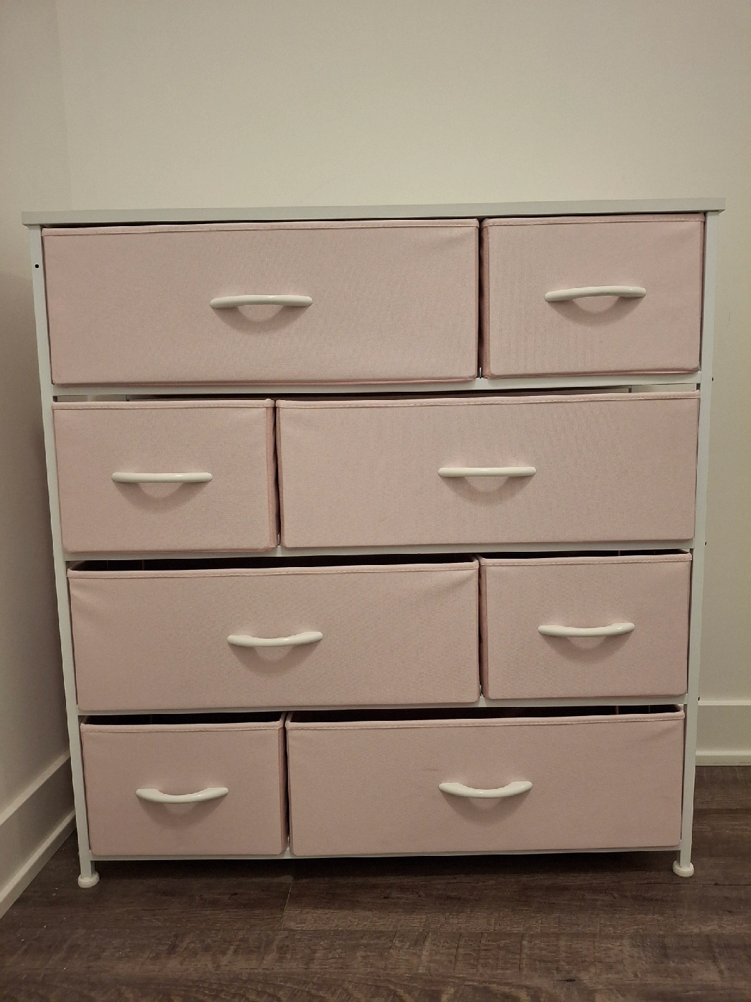 Selling a dresser with pink fabric drawers! It's in great shape and ready for a new home. Perfect for organizing clothes or toys.