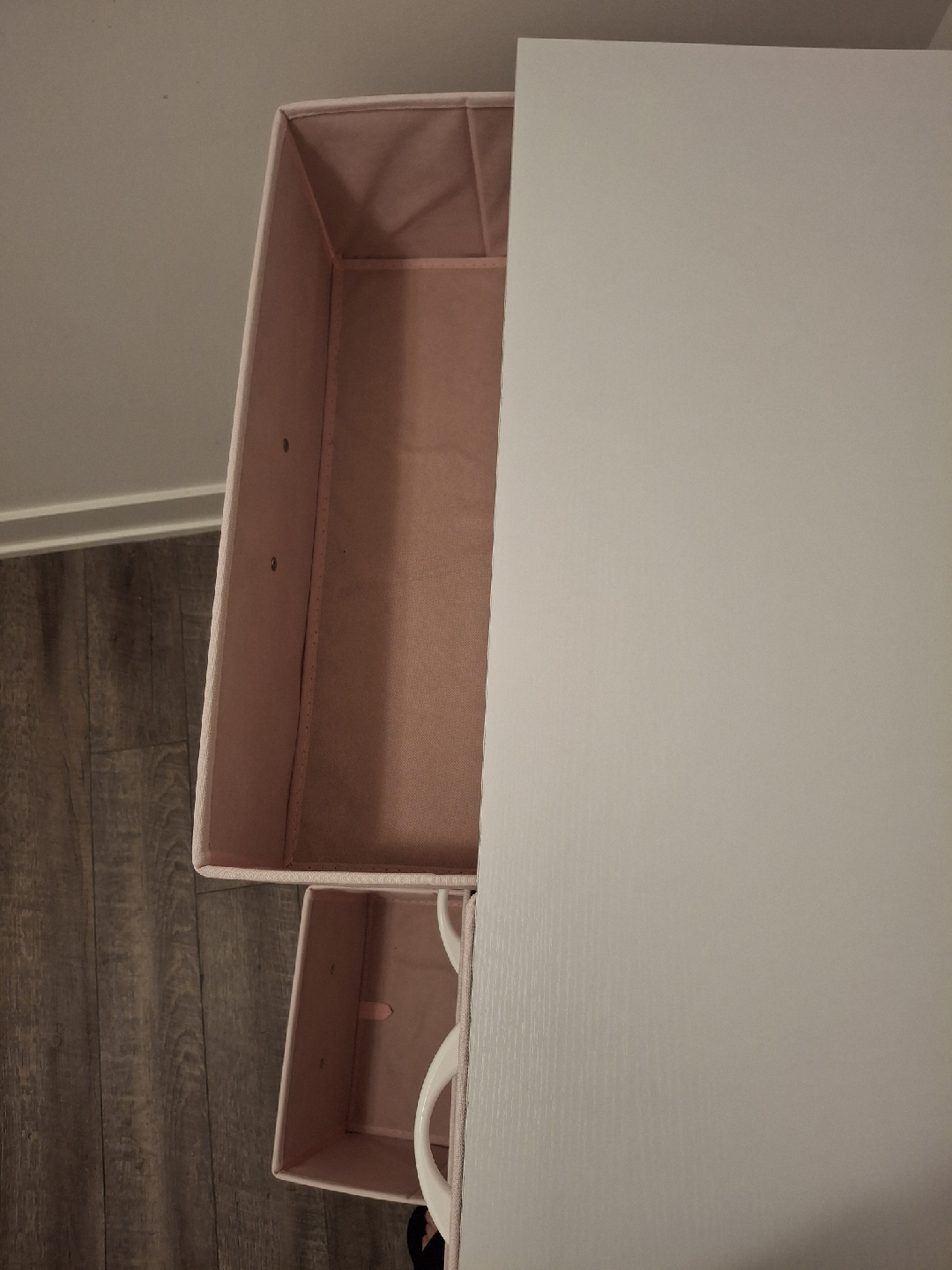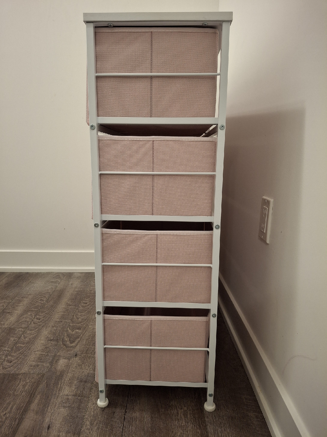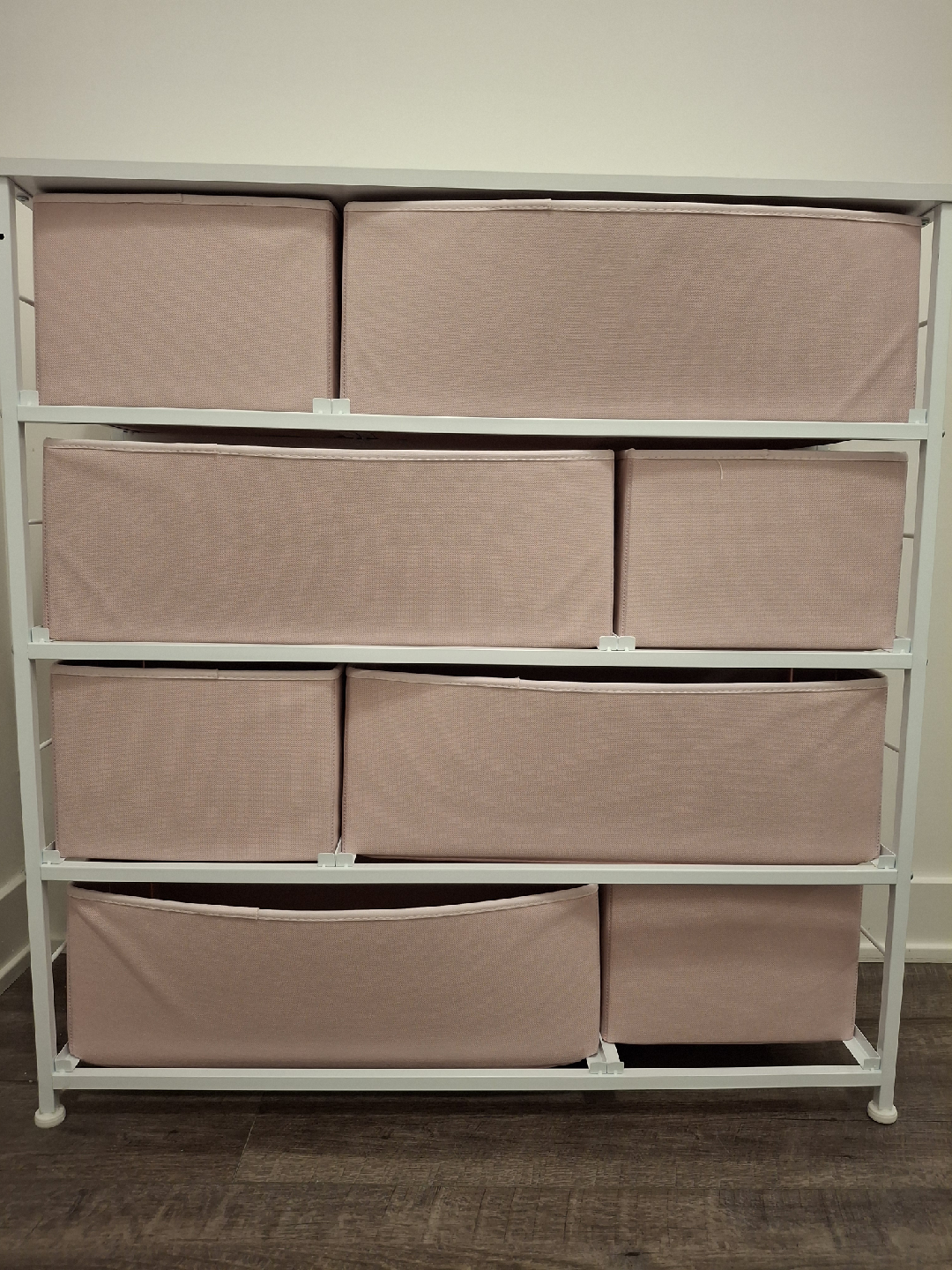 Selling a dresser with pink fabric drawers! It's in great shape and ready for a new home. Perfect for organizing clothes or toys.