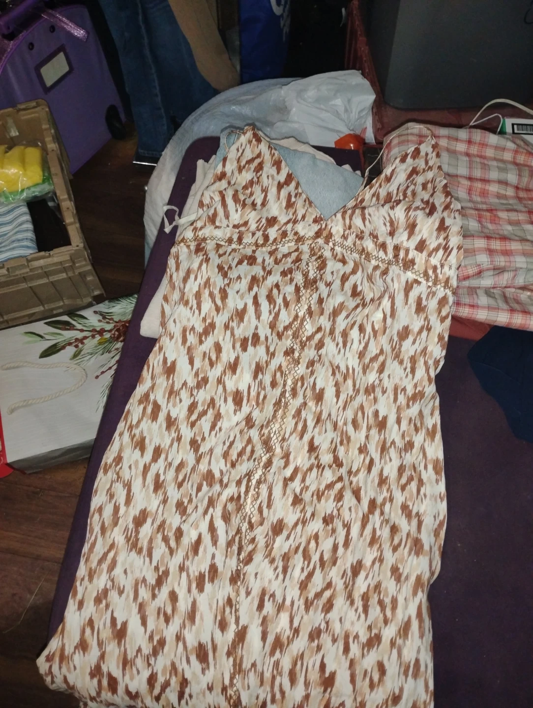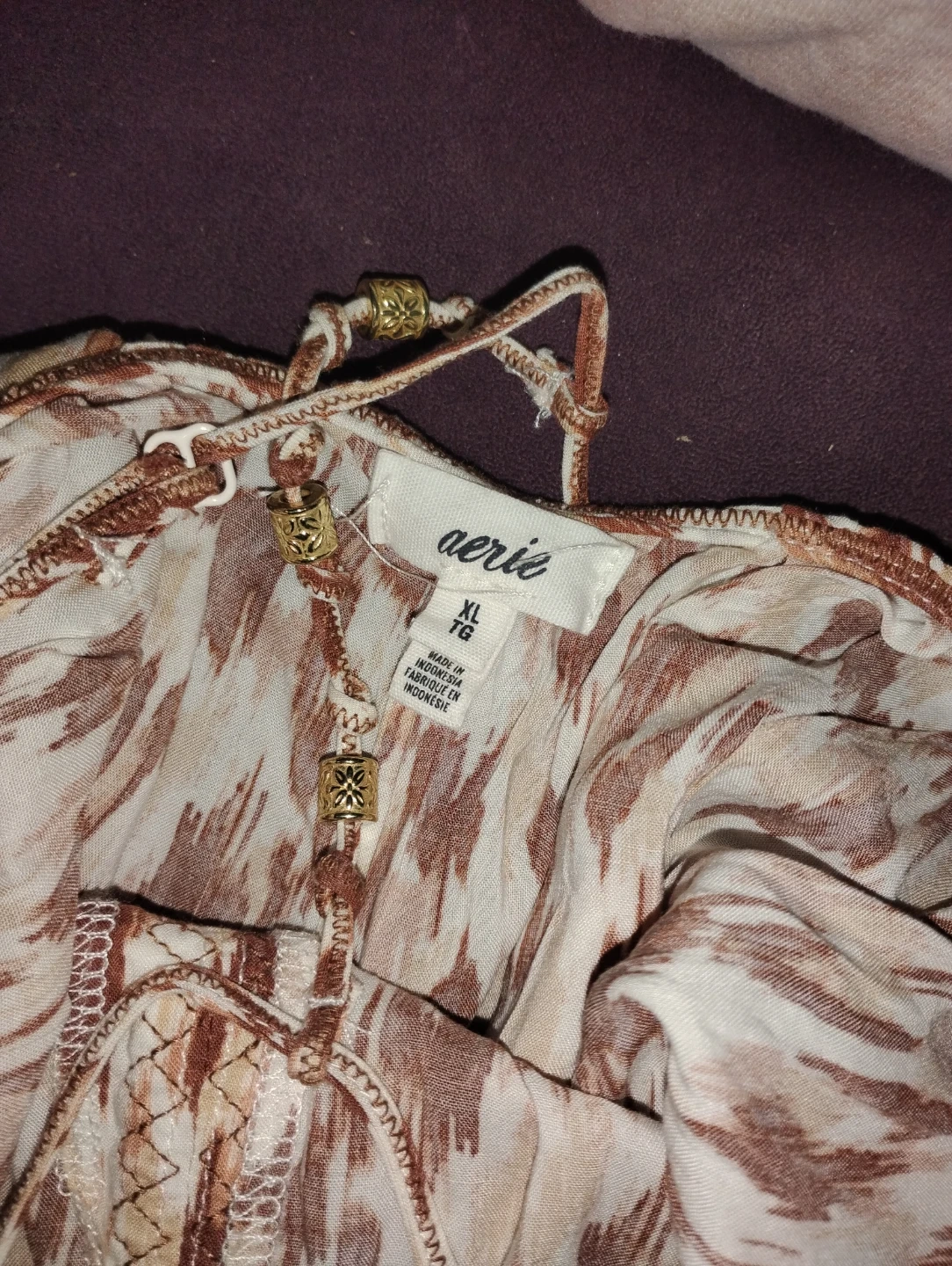 This Aerie camisole dress is a size XL. It has a V-neckline with adjustable straps and a tie detail. The fabric is lightweight with a brown and white abstract print.
