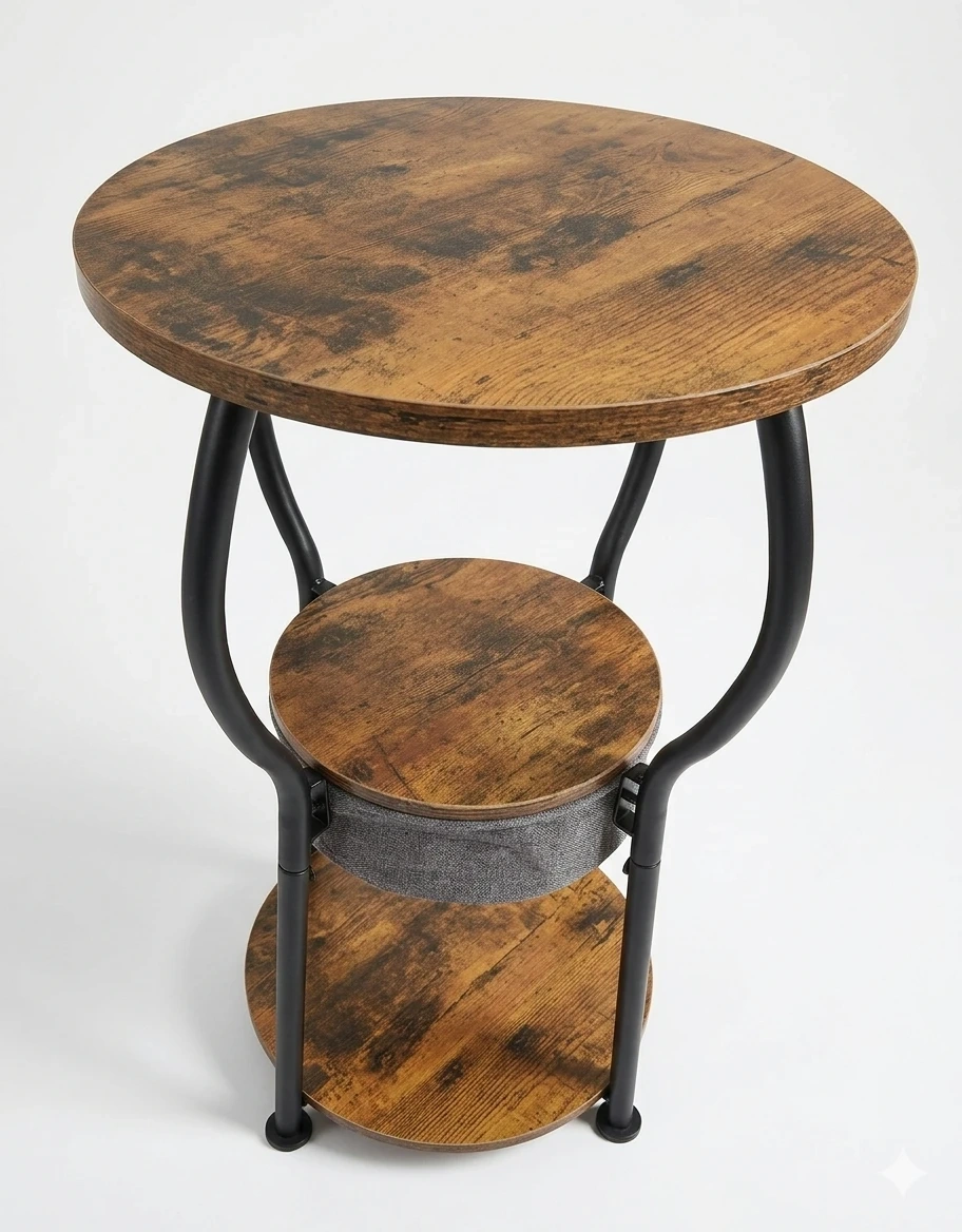 Round end table featuring a rustic wood-look top and a lower shelf. Includes a grey fabric storage basket. Its metal frame provides sturdy support.