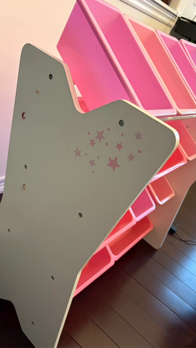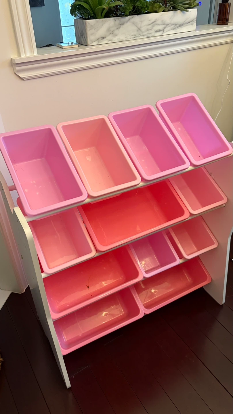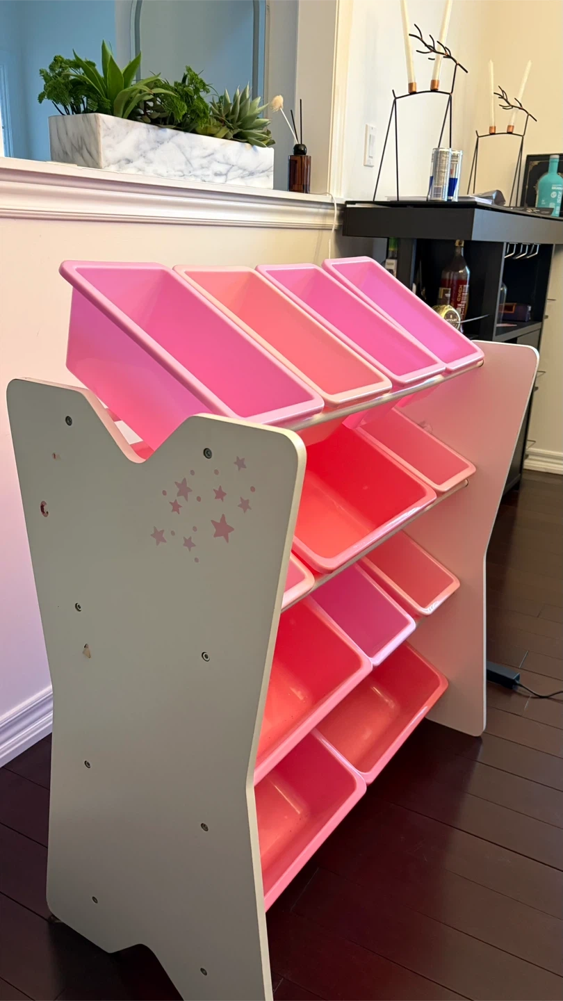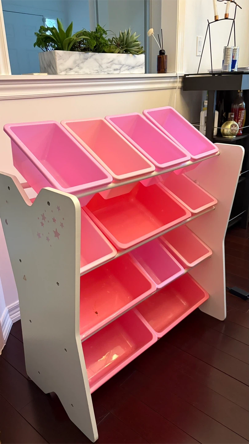 This toy organizer has a white frame with multiple pink bins for storage. It's perfect for tidying up a playroom or bedroom! The bins are removable for easy access.