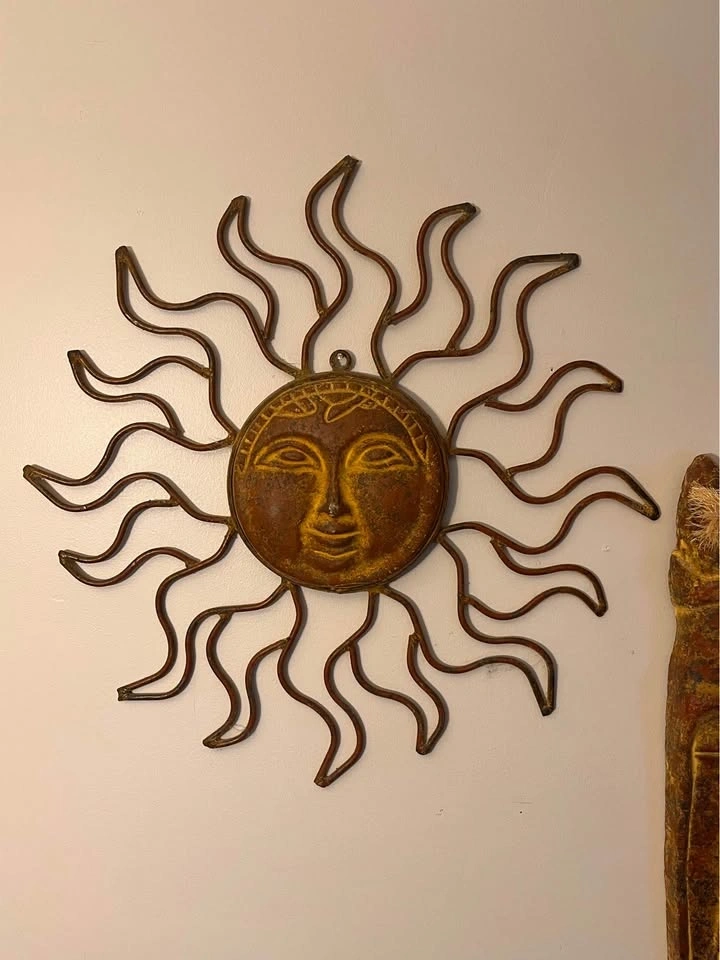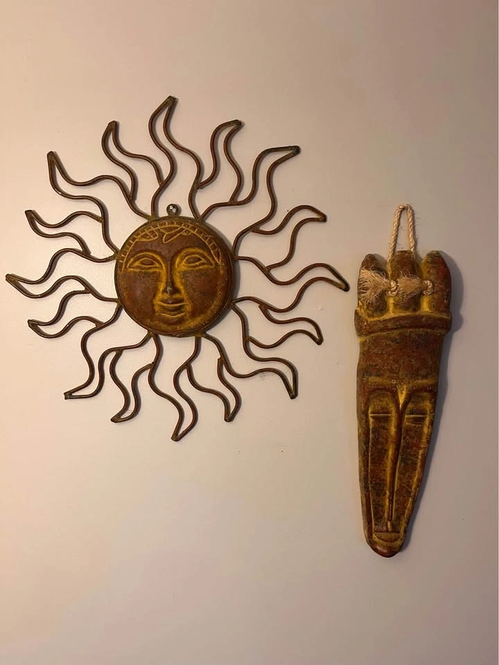 Heavy clay and metal sun wall decor and heavy southwestern mask wall decor. Excellent condition. Sun is 21” wide x 21” high. Mask is 19” high x 6” wide. $30 each or best reasonable offer.