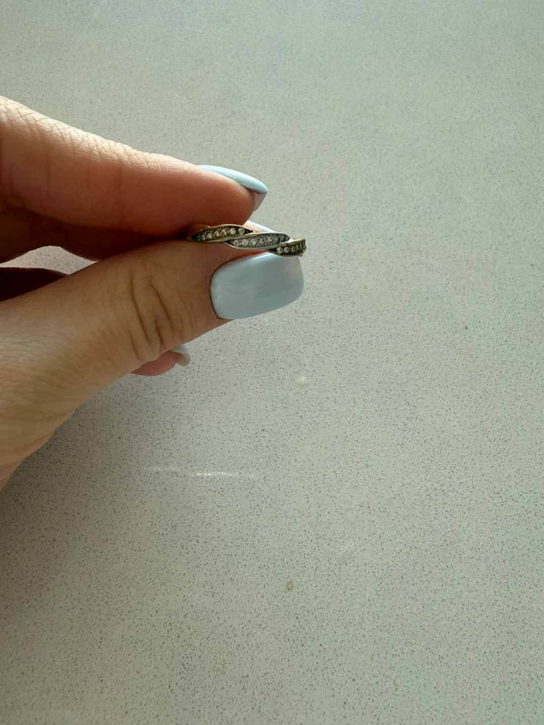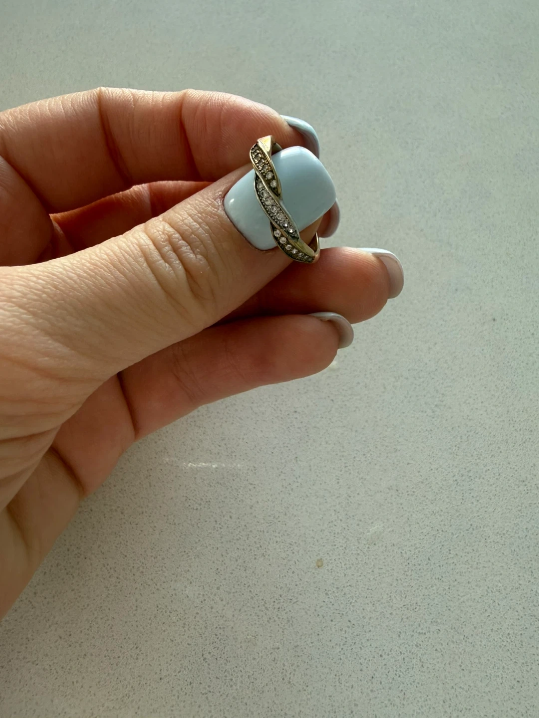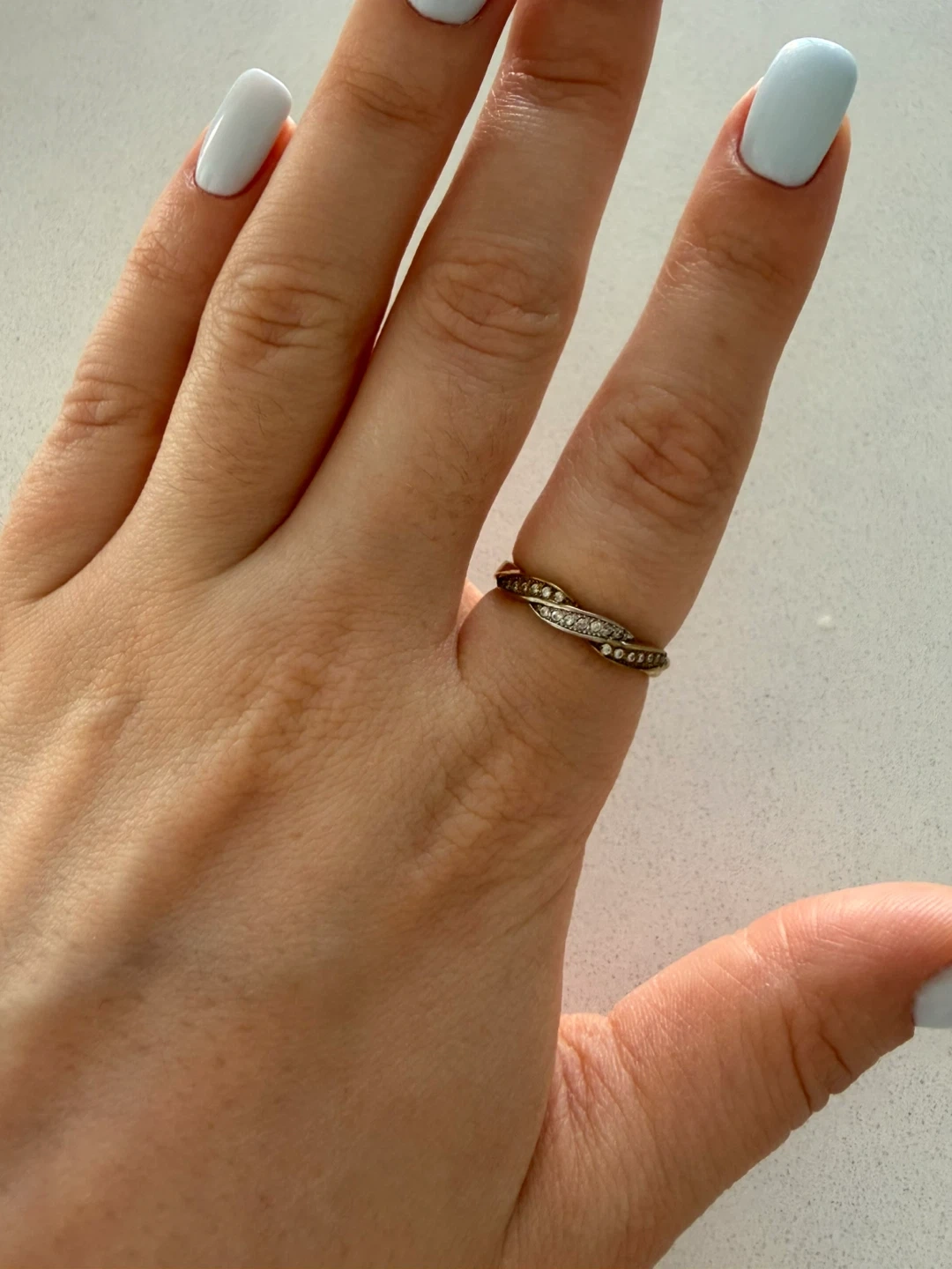 This ring has a gold-toned band with small, clear stones. The design is twisted.