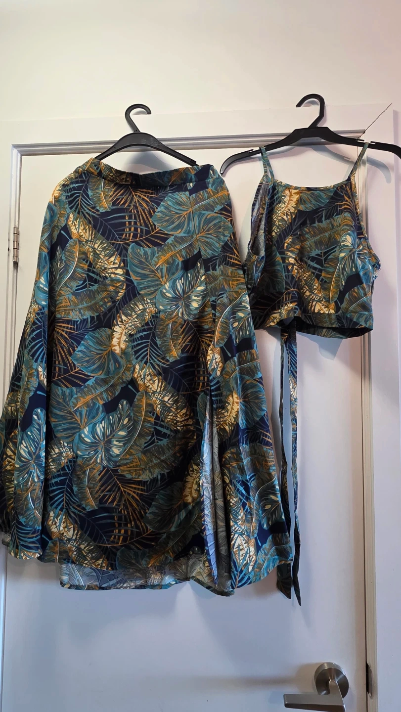 Two-piece set featuring a tropical leaf print. Includes a spaghetti strap crop top and a flowy midi skirt with a side slit. Lightweight fabric.