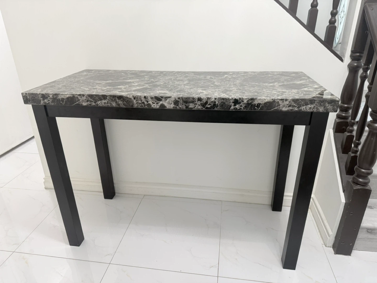 This console table features a black marble-look top and black legs. It's a stylish piece for your entryway or living space. Perfect for holding keys or decorative items!