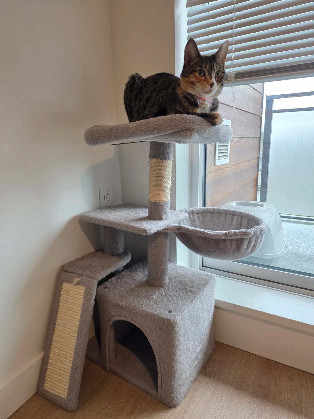 A multi-level cat tree condo covered in soft grey plush fabric. It features scratching posts wrapped in sisal rope, a cozy hammock, and an arched hideaway. There's also a ramp with a sisal scratching surface for easy climbing. It's perfect for cats to play, scratch, and relax on!)