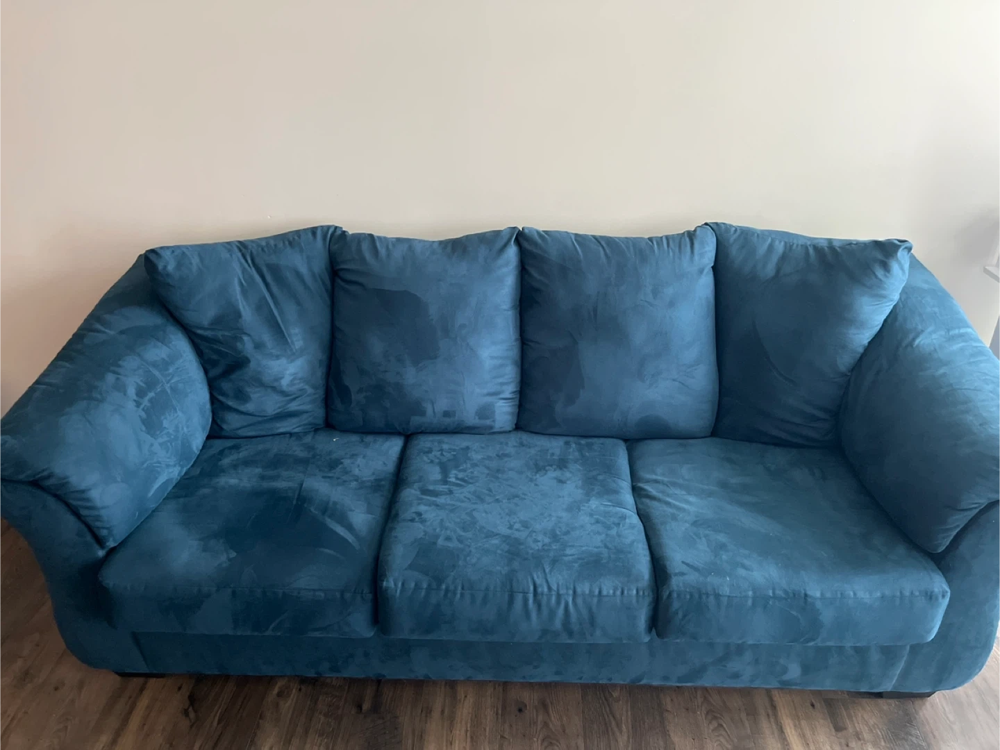 This is a comfortable teal blue three-seater sofa. It's upholstered in a soft fabric and has plush cushions. The sofa's frame is sturdy and it offers plenty of seating space for a family or guests.