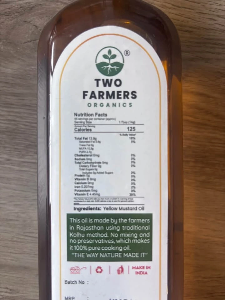 Premium Two Farmers Organics wood pressed yellow mustard oil. This is a 1L bottle, all natural and 100% vegan. Packaged in Dec 2025. Smoke and pet free house. Selling as moving out.