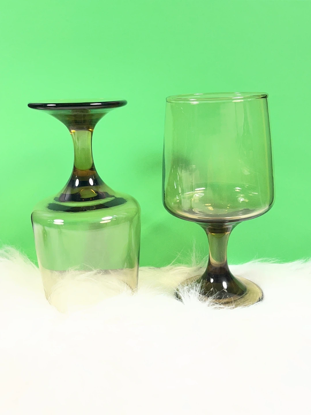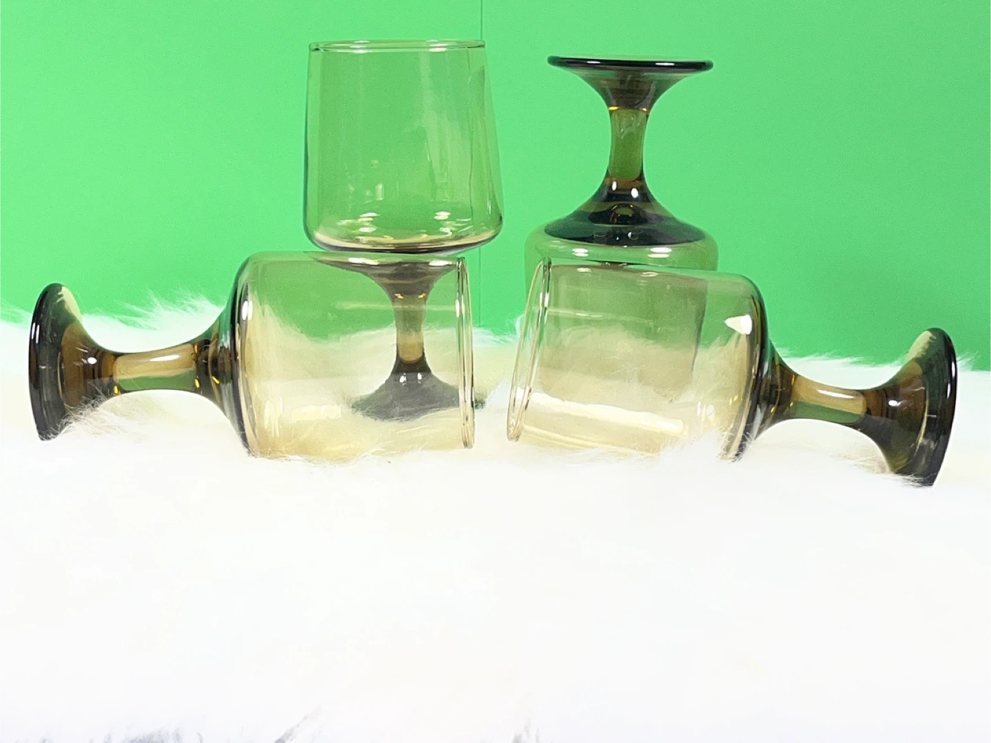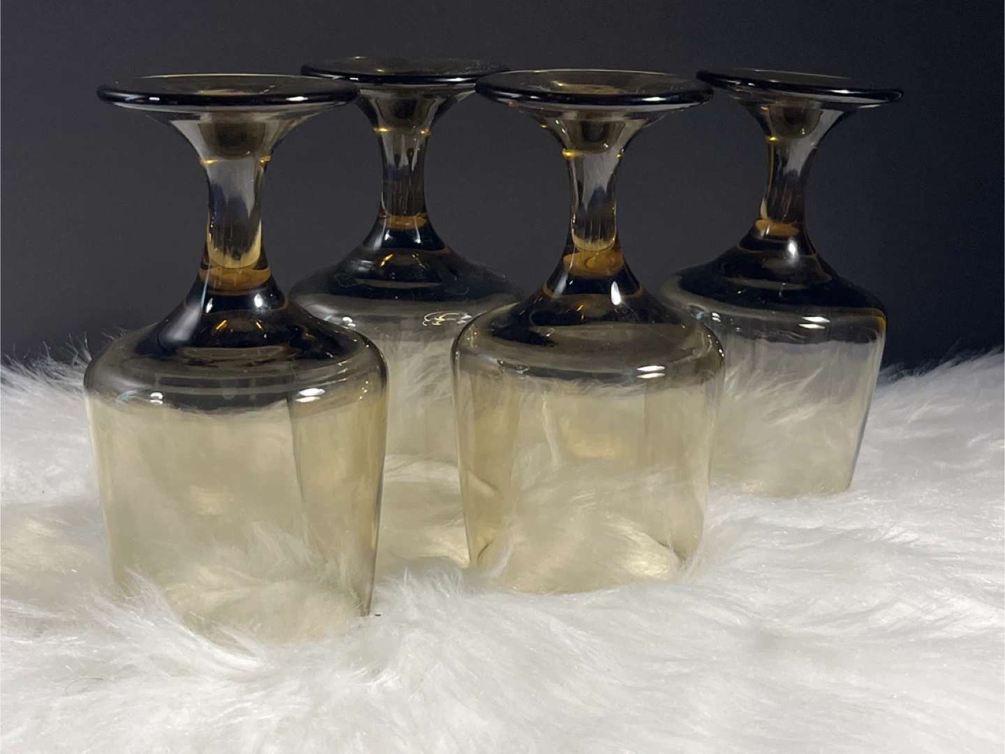 These vintage Libbey Tawny Accent goblets are featured in a smoke-tawny hue, a signature style of 1970s glassware. These versatile pieces, often described as water or wine goblets, were introduced by the Libbey Glass Company and are prized for their elegant, curvy silhouette.