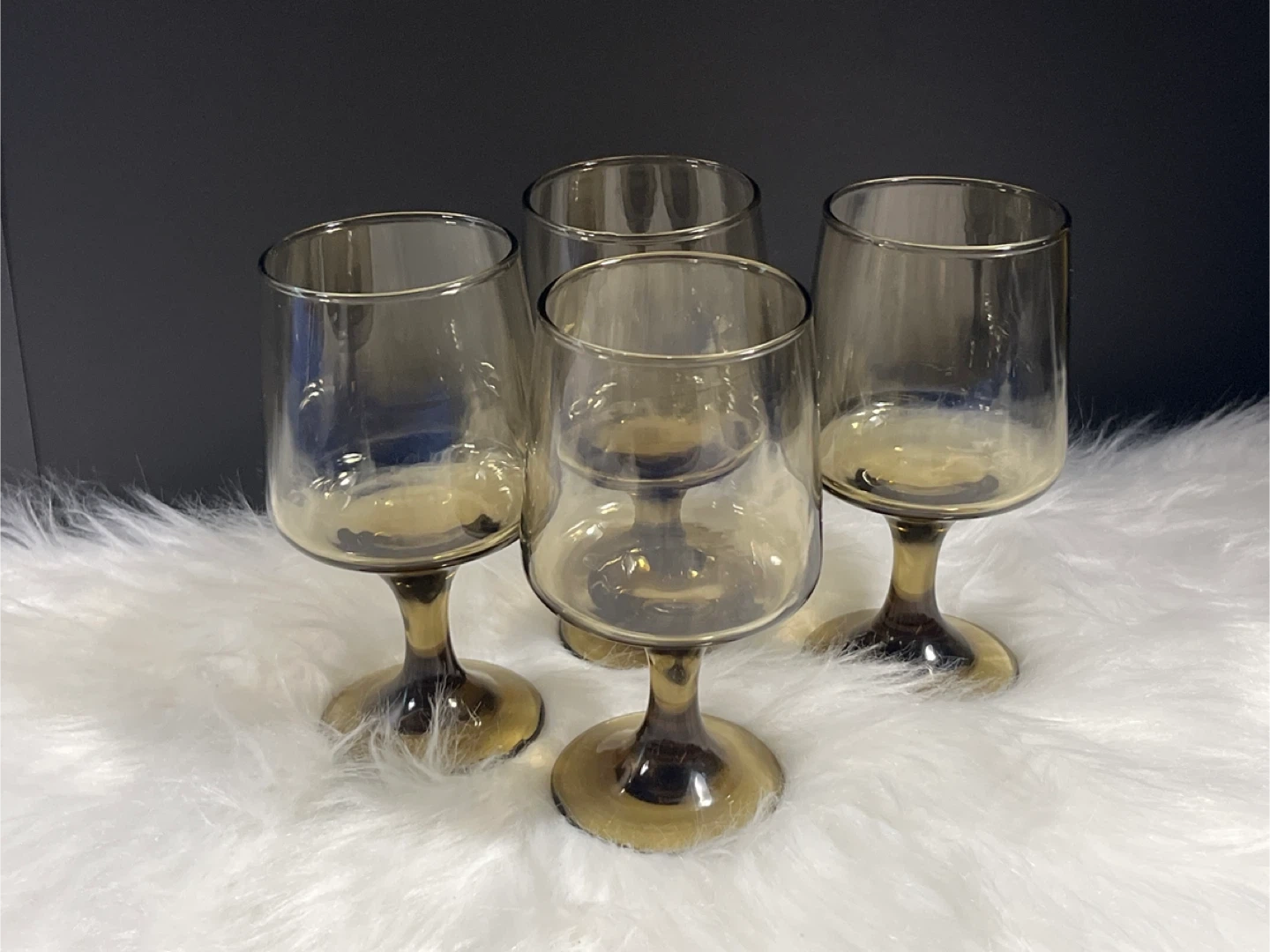 These vintage Libbey Tawny Accent goblets are featured in a smoke-tawny hue, a signature style of 1970s glassware. These versatile pieces, often described as water or wine goblets, were introduced by the Libbey Glass Company and are prized for their elegant, curvy silhouette.