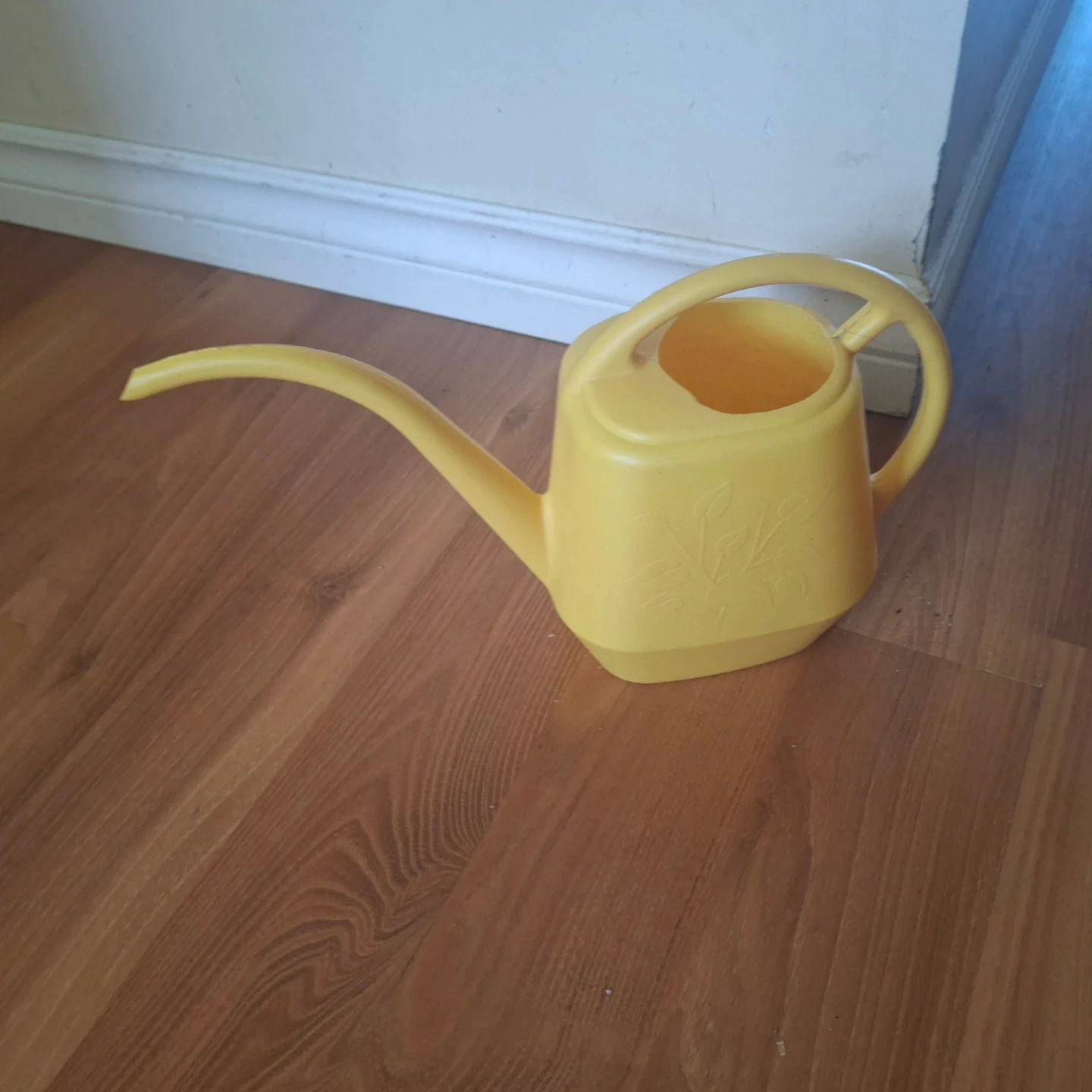 This is a yellow plastic watering can. It's great for indoor or outdoor plants. The spout is long and narrow for precise watering. A good size for small gardens or balcony plants!