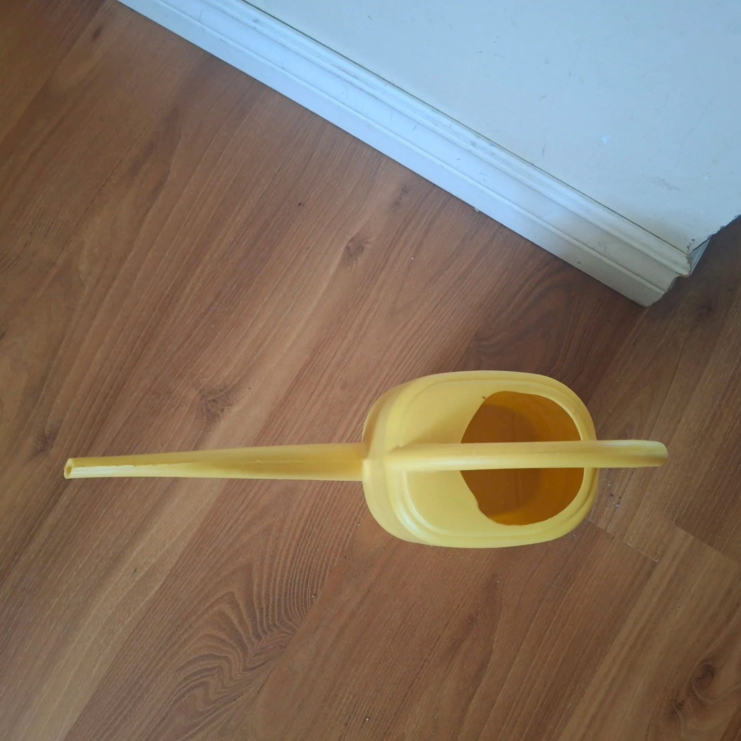 This is a yellow plastic watering can. It's great for indoor or outdoor plants. The spout is long and narrow for precise watering. A good size for small gardens or balcony plants!