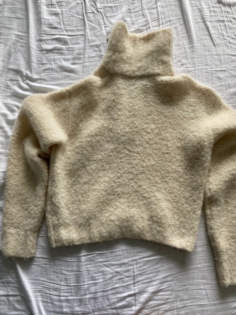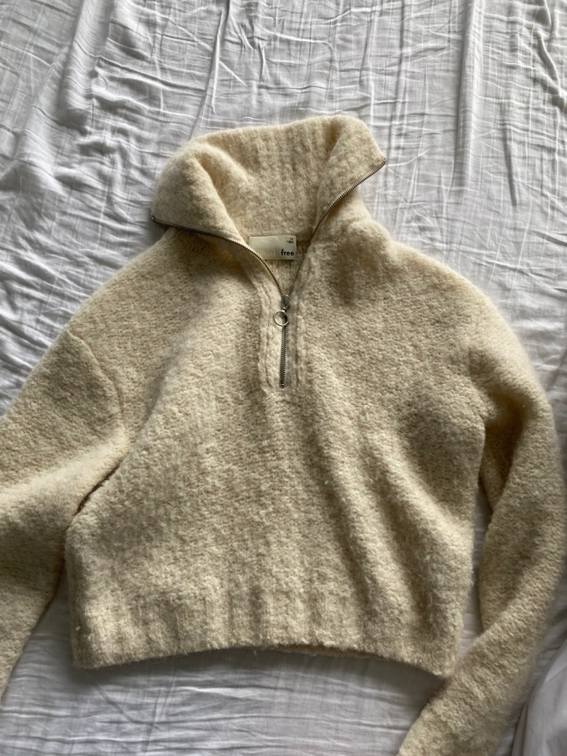 This is a half-zip, pullover sweater with a slightly cropped body. It's knit with a textural alpaca blend from Italy that's lightweight and warm.