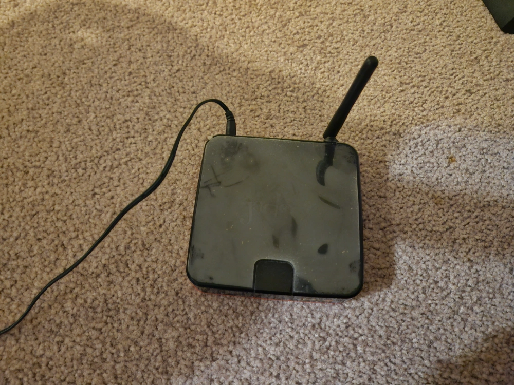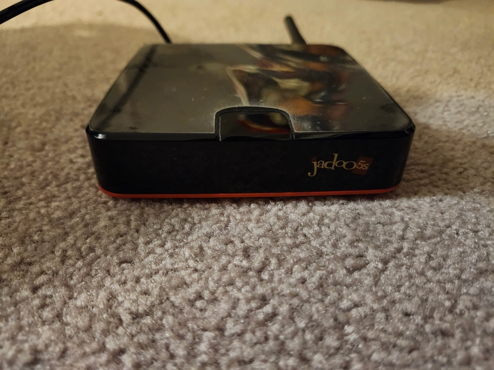 Pre-owned Jadoo HD streaming device. Black and orange. Includes antenna and power cord. Some cosmetic wear. Will give free ethernet cable.
