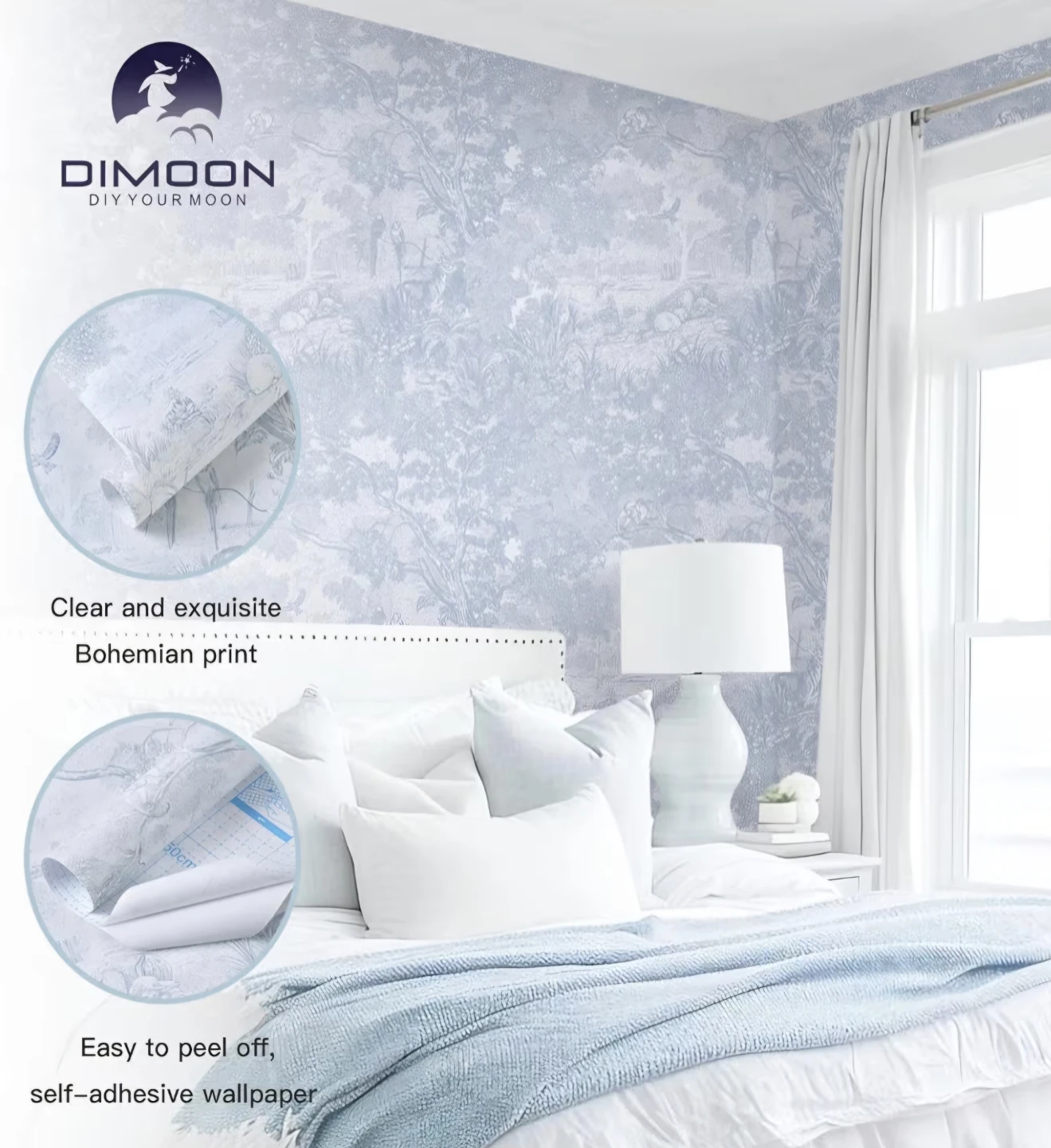 Peel and Stick Blue White Modern Forest Floral Wallpaper 17.3" X 78.7". Features a beautiful bohemian print in blue and white. It's perfect for adding a unique touch to any room's decor. Have multiple rolls available.