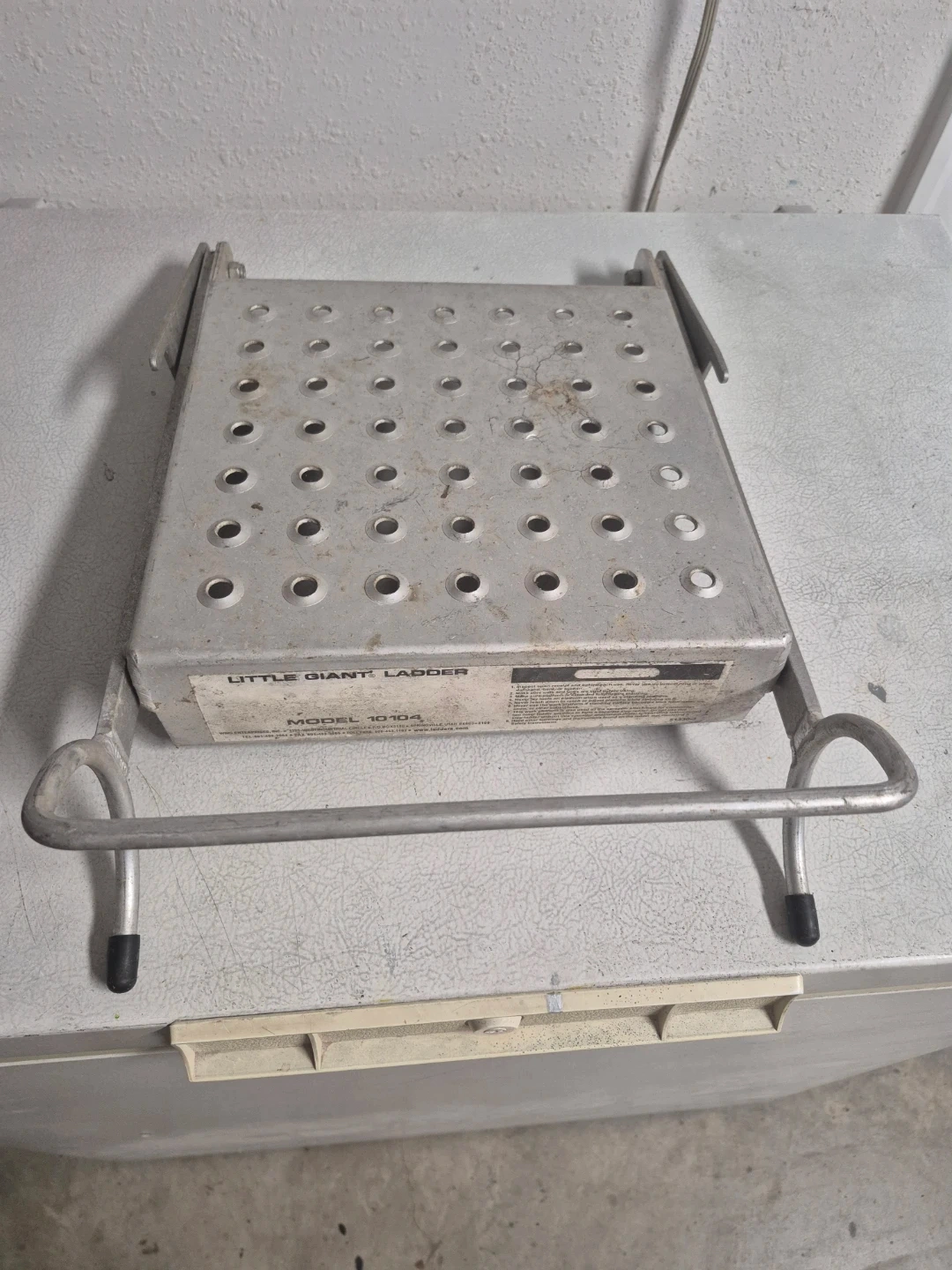 This is a Little Giant Ladder Model 10104 platform. It's made of aluminum. This platform is handy for reaching higher spots safely.