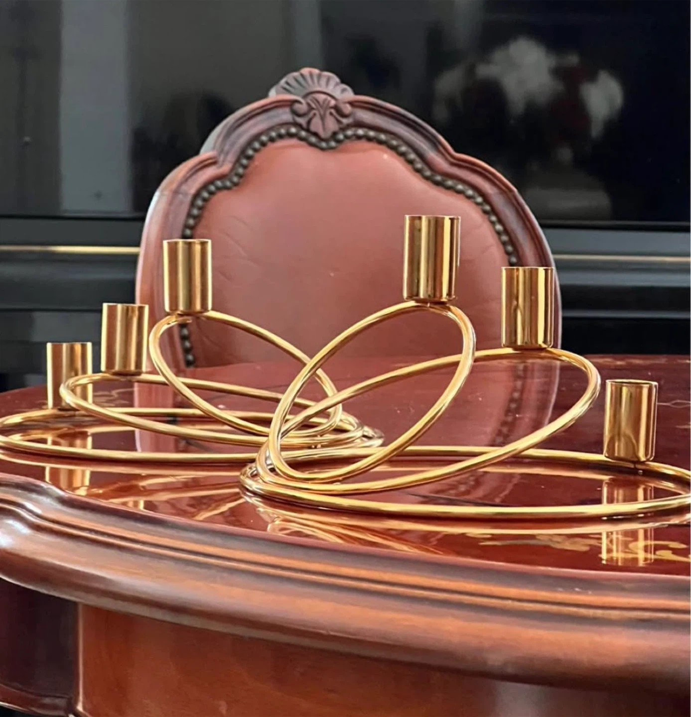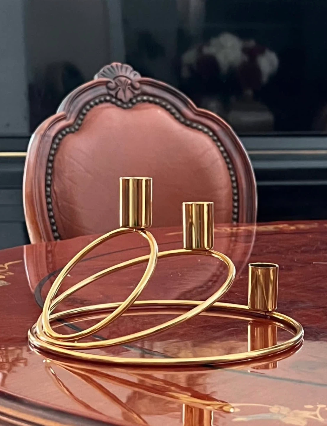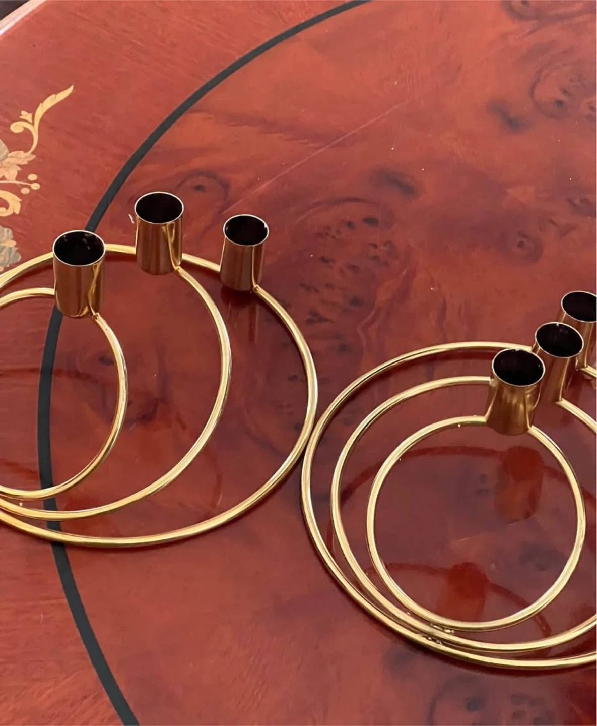 Add a touch of modern elegance to your space with this set of two gold-tone candlesticks. Each features a unique geometric ring design. Metal construction.