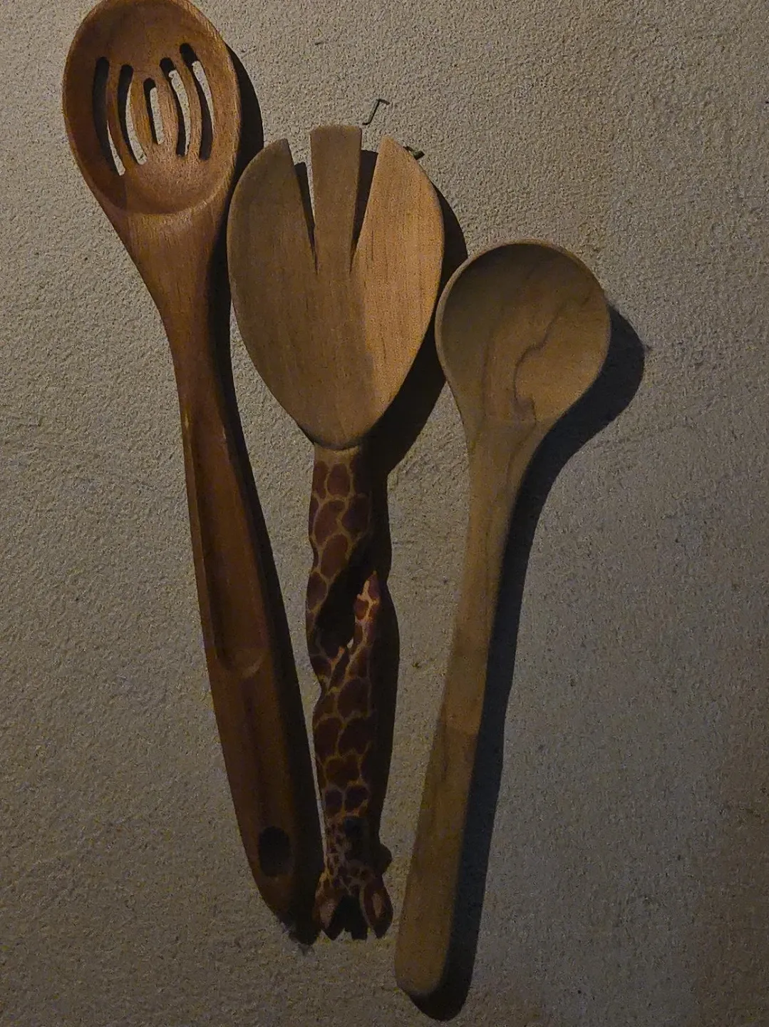 Set of three wooden kitchen utensils including a slotted spoon, a salad server, and a solid spoon. One server has a unique giraffe pattern carved into its handle. Made from wood.