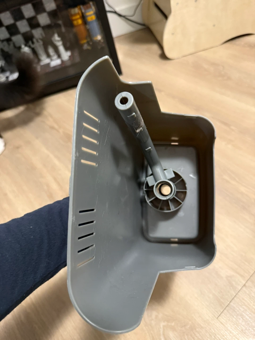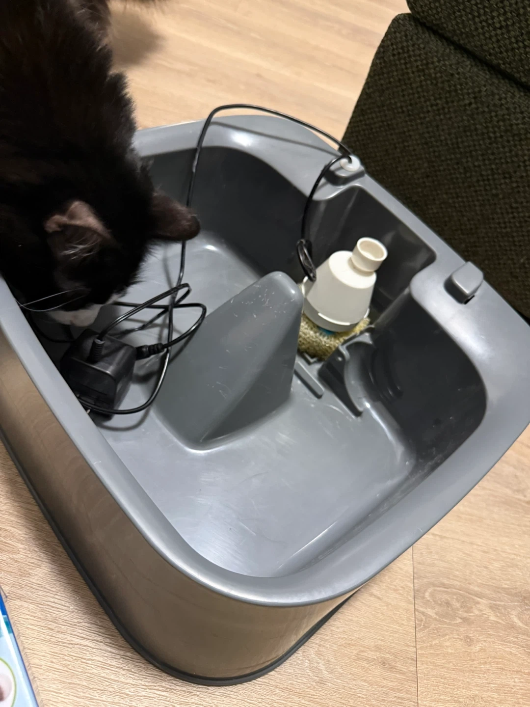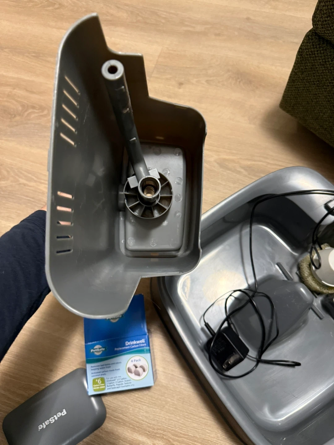 This is a grey plastic PetSafe Drinkwell pet water fountain. It's a 2-liter capacity model. Includes AC adapter and a pack of replacement filters.
