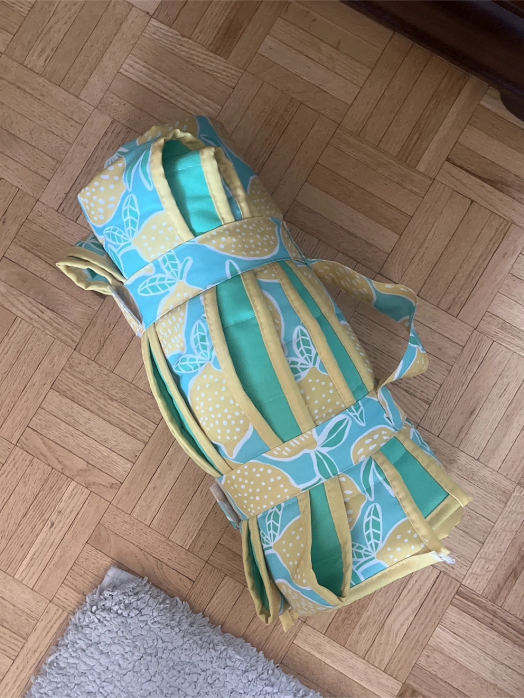 This picnic blanket features a fun lemon print. It's designed for outdoor use with a convenient roll-up design and straps. Great for park trips or beach days!