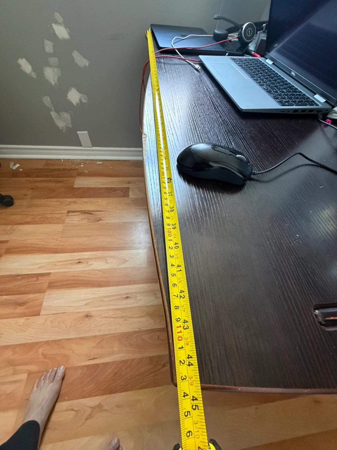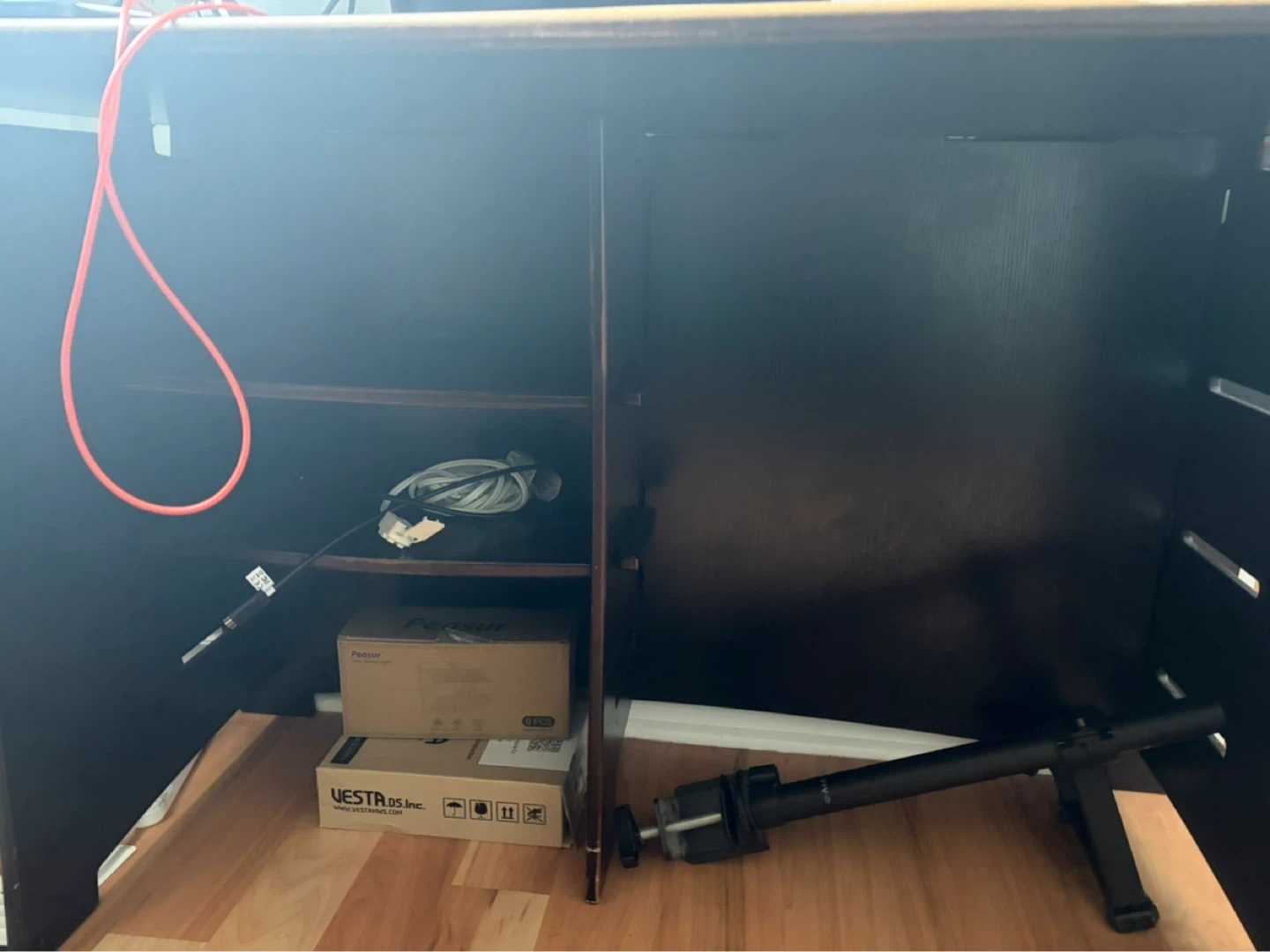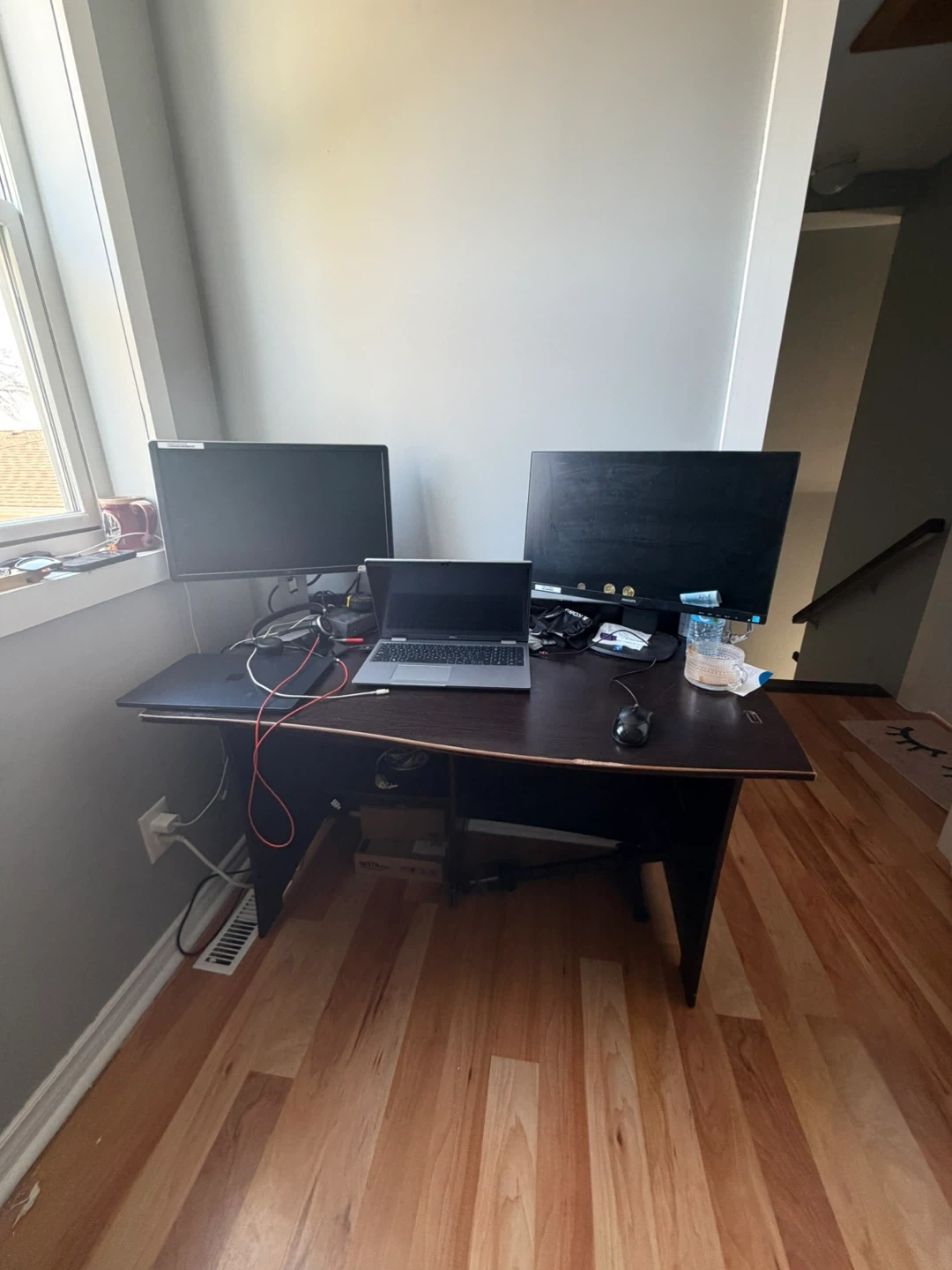 A spacious computer desk with a dark brown finish. It's ideal for setting up a multi-monitor workstation. Plenty of surface space for your computer setup!