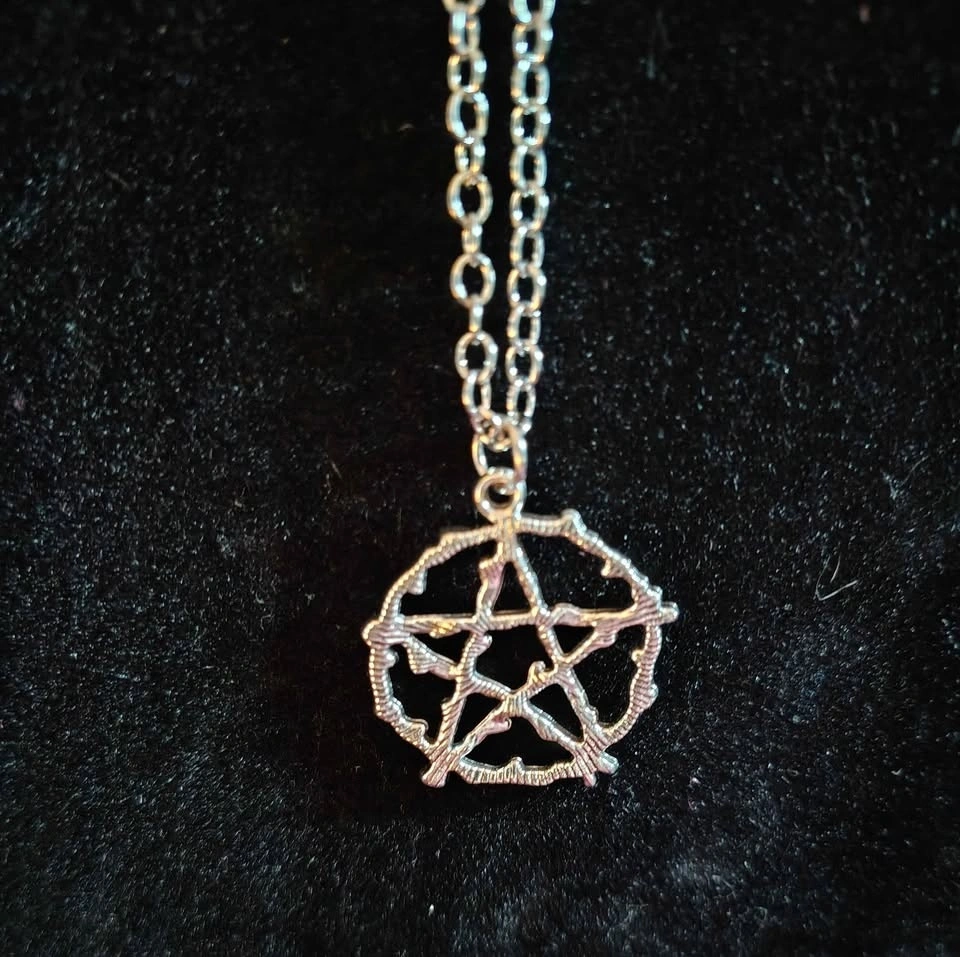 New pentagram pendant necklace. Benefits: Spiritual Protection (shields from negative energies), Balance and Harmony (represents balance between elements), Grounding (helps maintain focus), Empowerment (boosts personal strength), Connection to Nature (fosters a deeper bond with the natural world), and Manifestation (aids in manifesting intentions). Located in Crowsnest Pass.