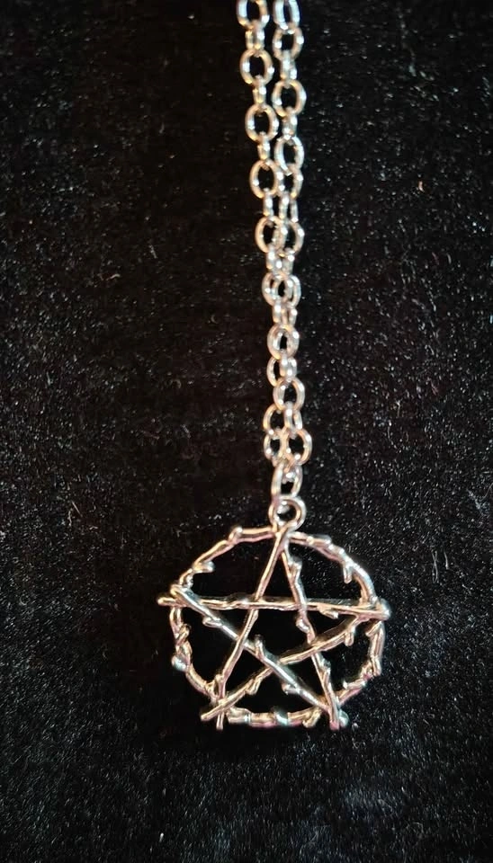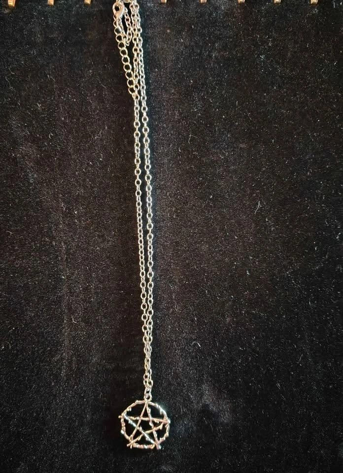 New pentagram pendant necklace. Benefits: Spiritual Protection (shields from negative energies), Balance and Harmony (represents balance between elements), Grounding (helps maintain focus), Empowerment (boosts personal strength), Connection to Nature (fosters a deeper bond with the natural world), and Manifestation (aids in manifesting intentions). Located in Crowsnest Pass.