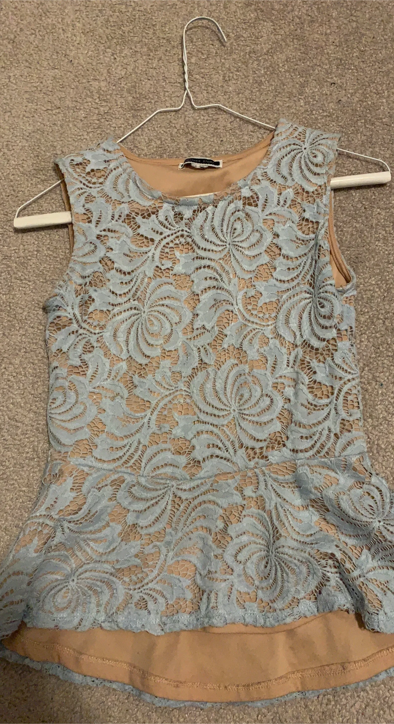 This is a beautiful blue lace peplum top from Another Story. It's in great condition and would be a lovely addition to your wardrobe!
