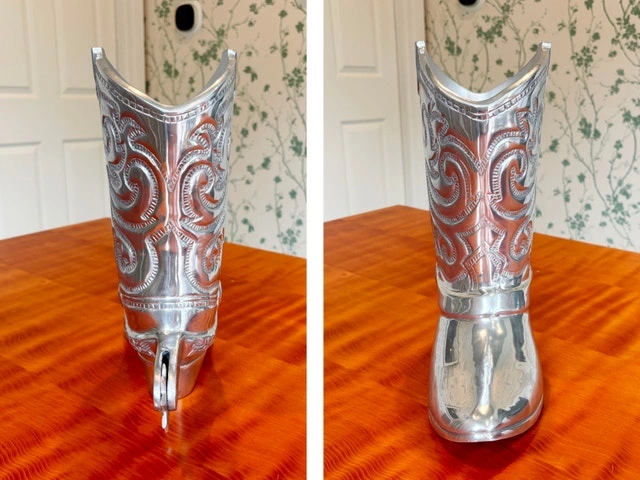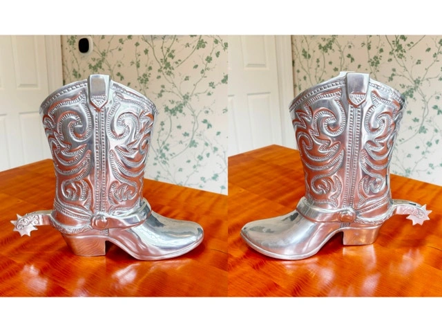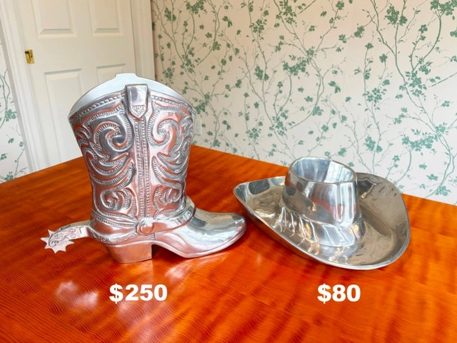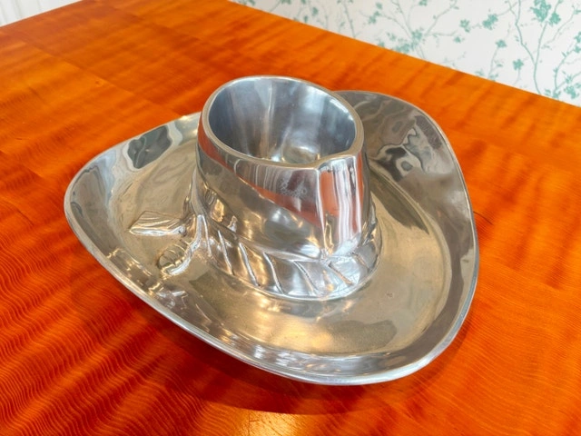 - Price is firm. Cash Only. Mint condition. - Pickup near Pen Centre in St. Catharines. - Boot Vase Wine Ice Bucket (15”H x 12”L) $250. - Cowboy Hat Chip & Dip (15" x 14.5" 4.5" tall) $80. -Polished Aluminum. Made by Towle Silversmiths.