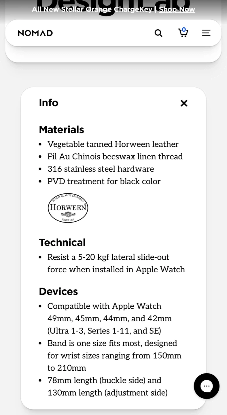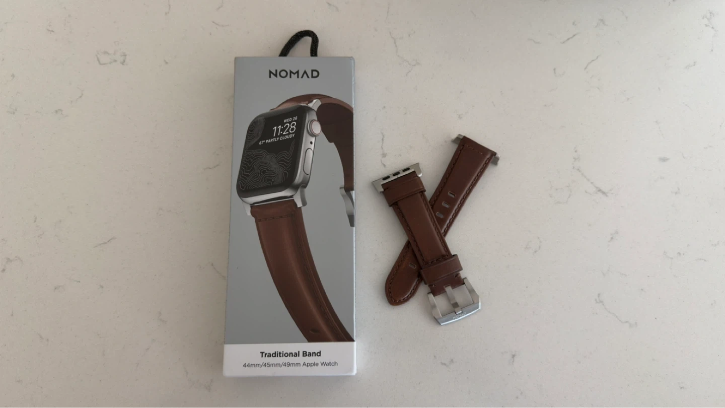 Nomad Traditional Band for Apple Watch made from vegetable tanned Horween leather. It's compatible with Apple Watch Ultra, Series 1-11, and SE. Band fits wrist sizes from 150mm to 210mm.