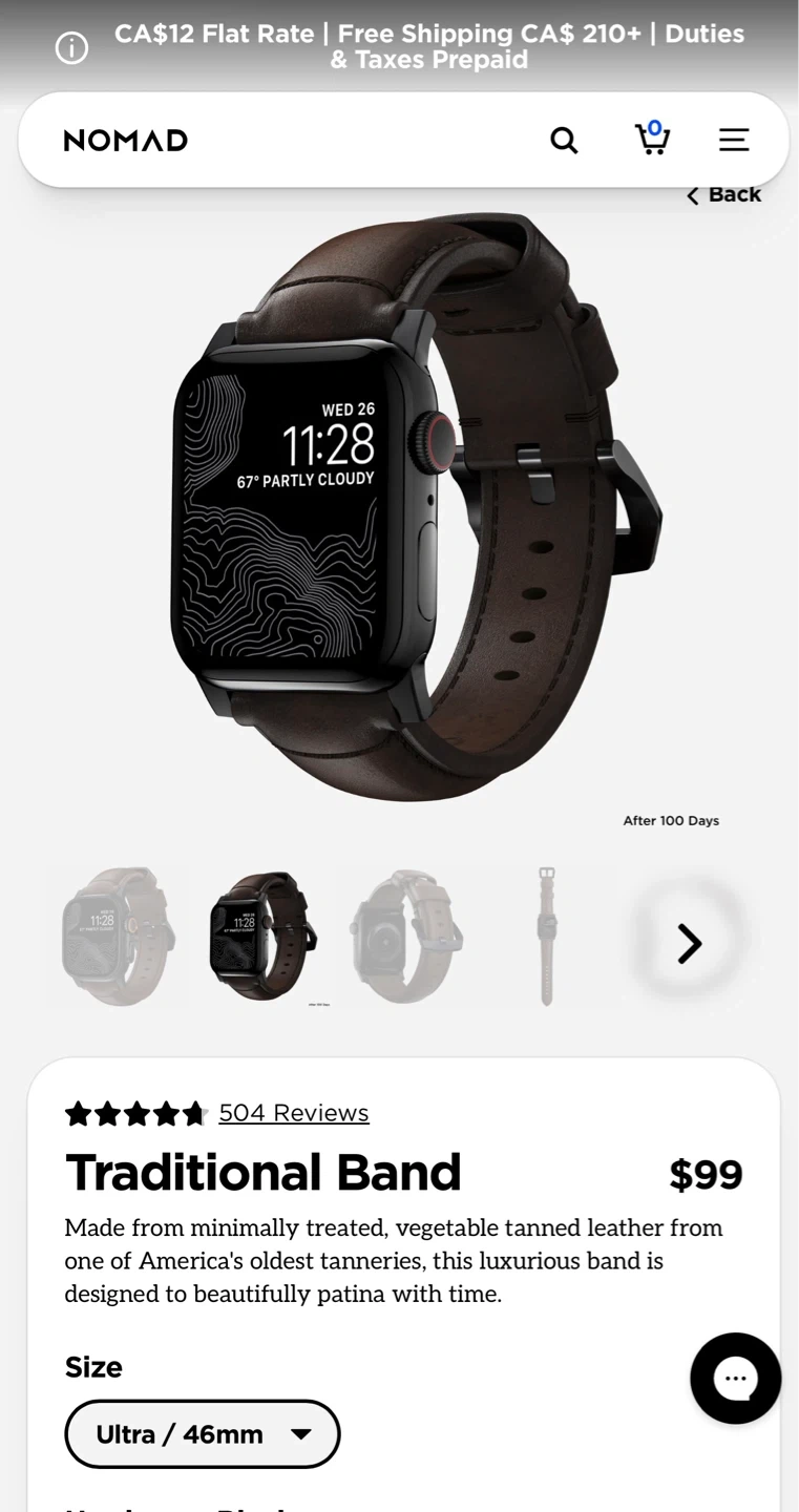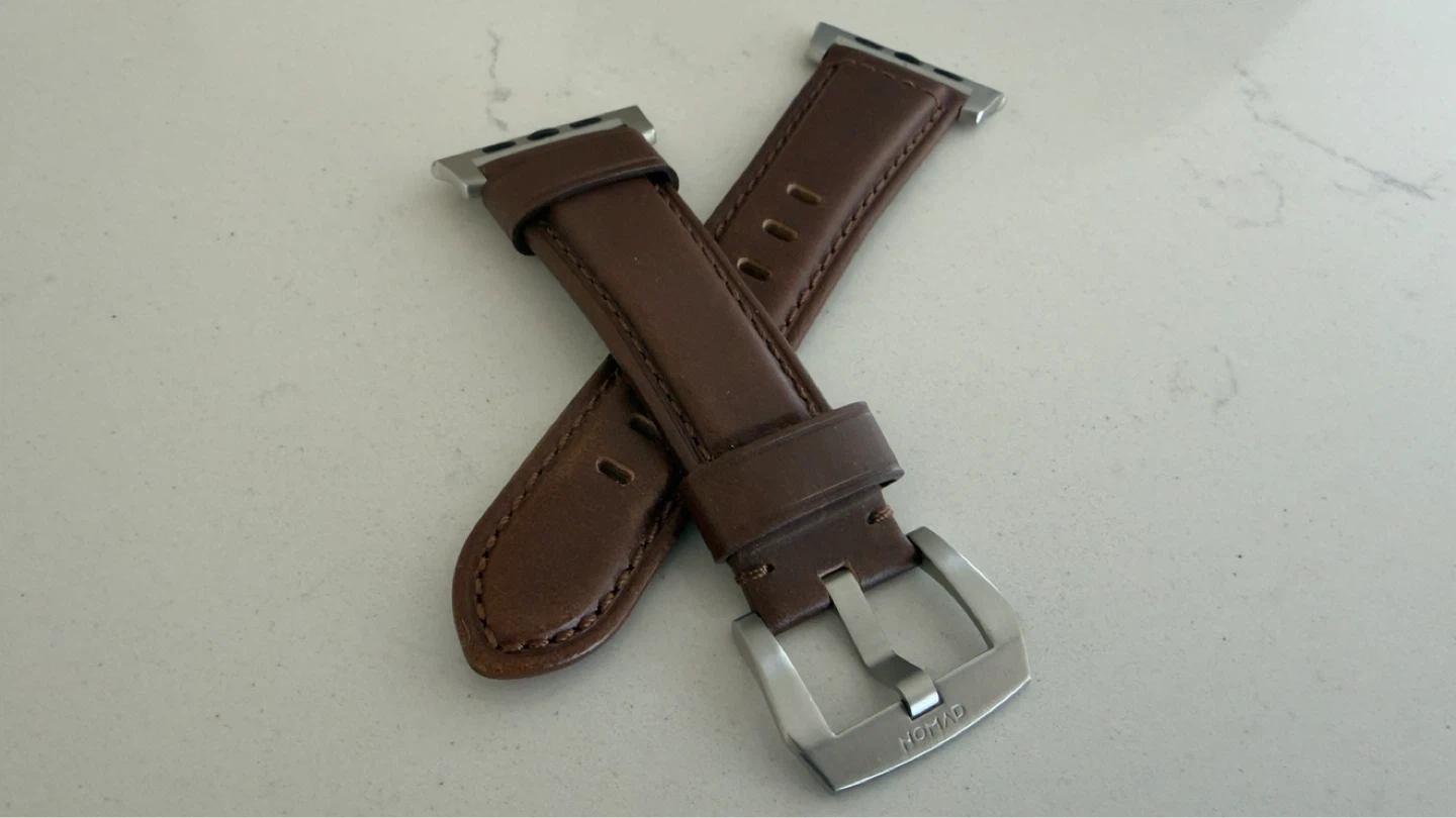 Nomad Traditional Band for Apple Watch made from vegetable tanned Horween leather. It's compatible with Apple Watch Ultra, Series 1-11, and SE. Band fits wrist sizes from 150mm to 210mm.