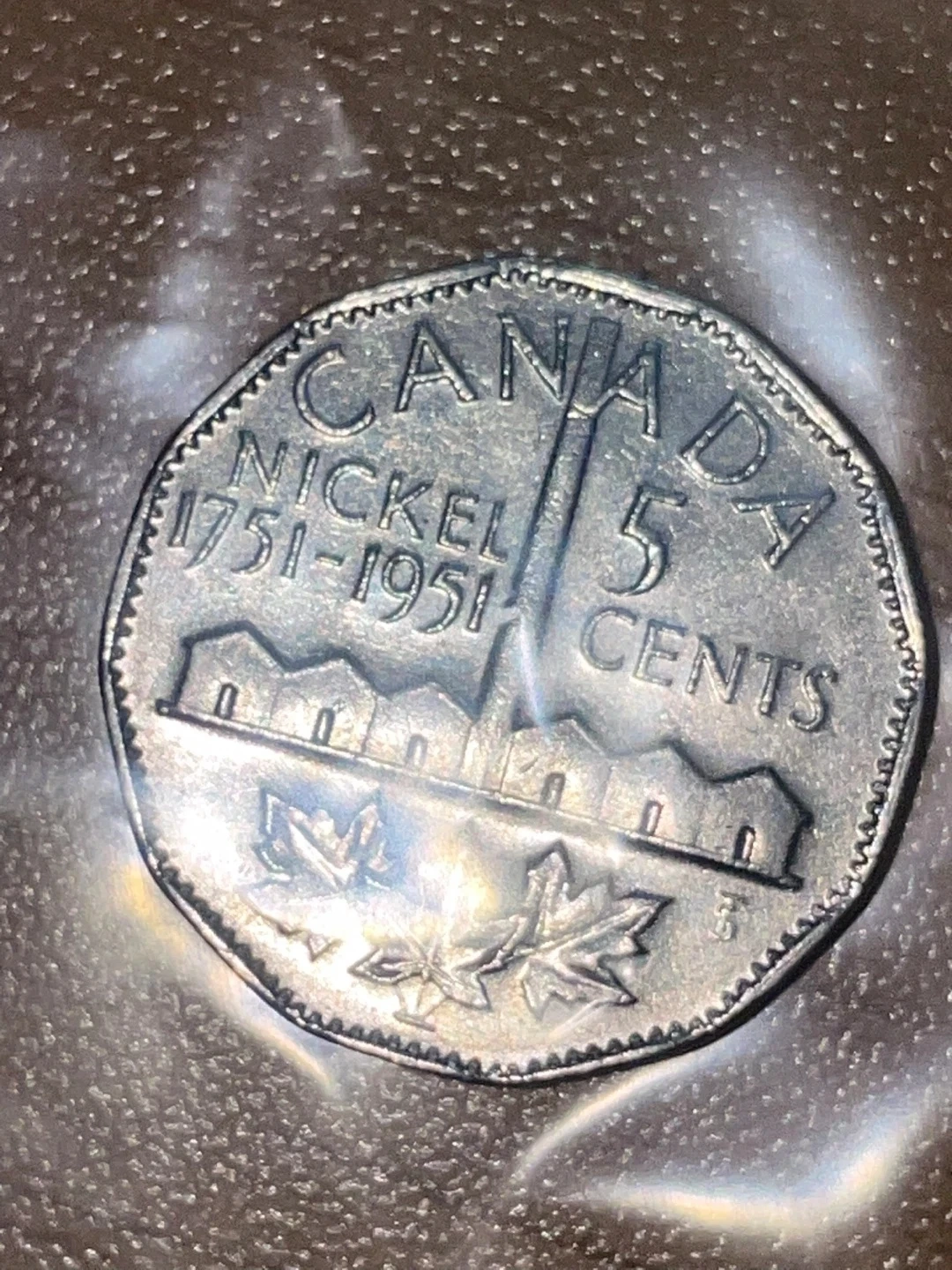 Commemorative Canadian 5 cents coin. It's made of nickel and features King George VI on one side. The other side shows "Canada 5 Cents" with architectural designs and maple leaves. This coin marks the period from 1751 to 1951. A nice piece for collectors!