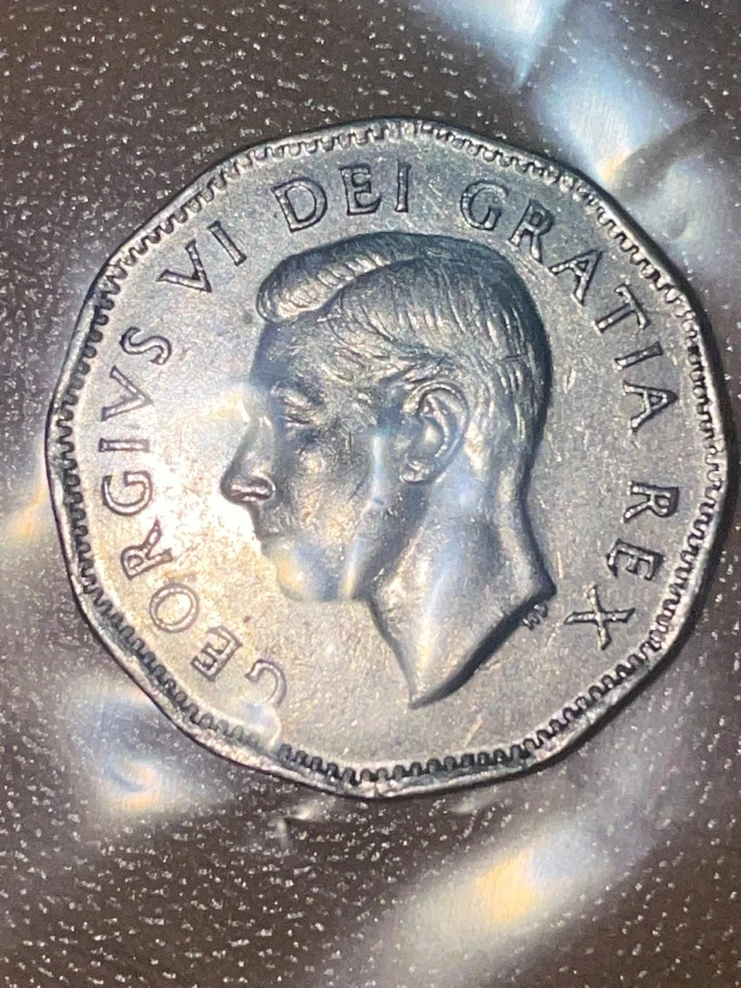 Commemorative Canadian 5 cents coin. It's made of nickel and features King George VI on one side. The other side shows "Canada 5 Cents" with architectural designs and maple leaves. This coin marks the period from 1751 to 1951. A nice piece for collectors!